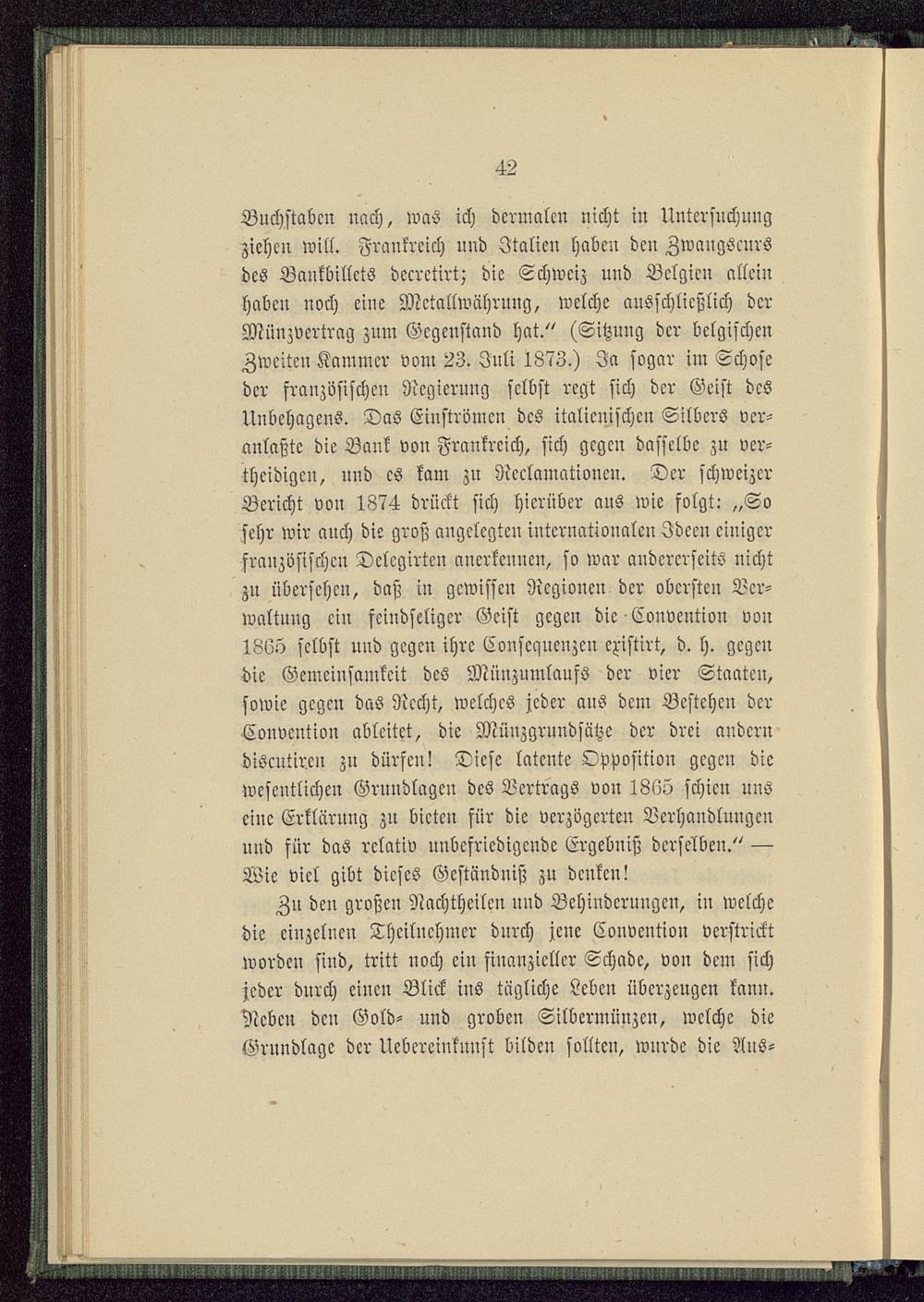 Buchstaben nach, was ich dermalen nicht in Untersuchungziehen will. Frankreich und Italien haben den Zwangscnrsdes VaukbillctS decretirt; die Schweiz und Belgien alleinhaben noch eine Mctallwähruug, welche ausschließlich derMünzvertrag zum Gegenstand hat." (Sitzung der belgischenZweiten Kammer vom 23. Juli 1873.) Ja sogar im Schoscder französischen Regierung selbst regt sich der Geist desUnbehagens. Das Einströmen des italienischen Silbers ver-anlaßte die Bank von Frankreich , sich gegen dasselbe zu ver-theidigen, und es kam zn Rcclamationcn. Der schweizer Bericht von 1874 drückt sich hierüber aus wie folgt: „Sosehr wir auch die groß angelegten internationalen Ideen einigerfranzösischen Dclcgirtcn anerkennen, so war andererseits nichtzu übersehen, daß in gewissen Regionen der obersten Ver-waltung ein feindseliger Geist gegen die Convention von1865 selbst und gegen ihre Eonscqncnzc» cxistirt, d. h. gegendie Gemeinsamkeit des Münzumlaufs der vier Staaten,sowie gegen das Recht, welches jeder aus dem Bestehen derConvention ableitet, die Müuzgrundsätzc der drei ander»diöcutircu zn dürfen! Diese latente Opposition gegen diewesentliche» Grundlagen des Vertrags von 1865 schien unseine Erklärung zu biete» für die verzögerten Vcrhandlungcuund für das relativ unbefriedigende Ergebniß derselben." —Wie viel gibt dieses Geständniß zu dcukcu!