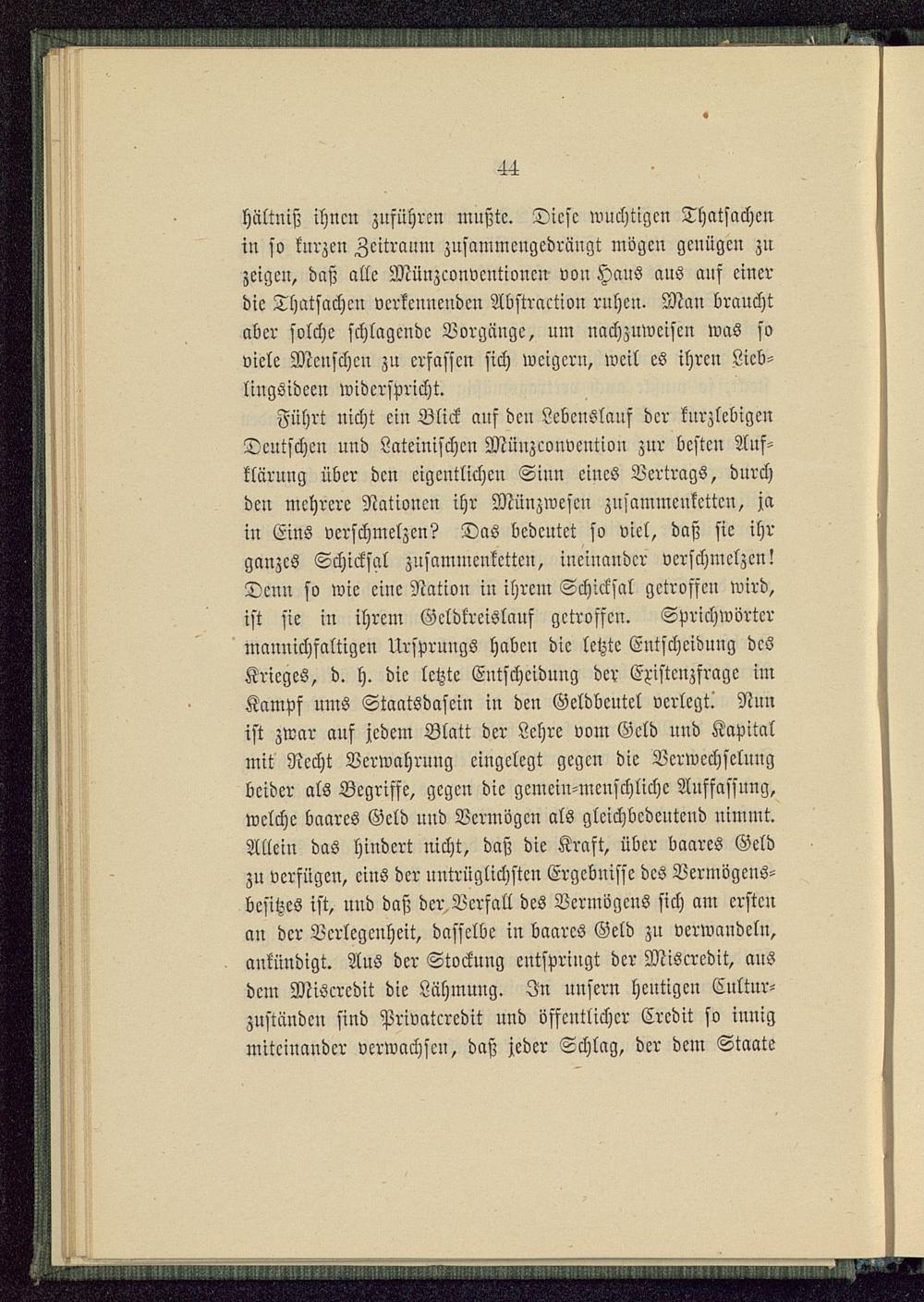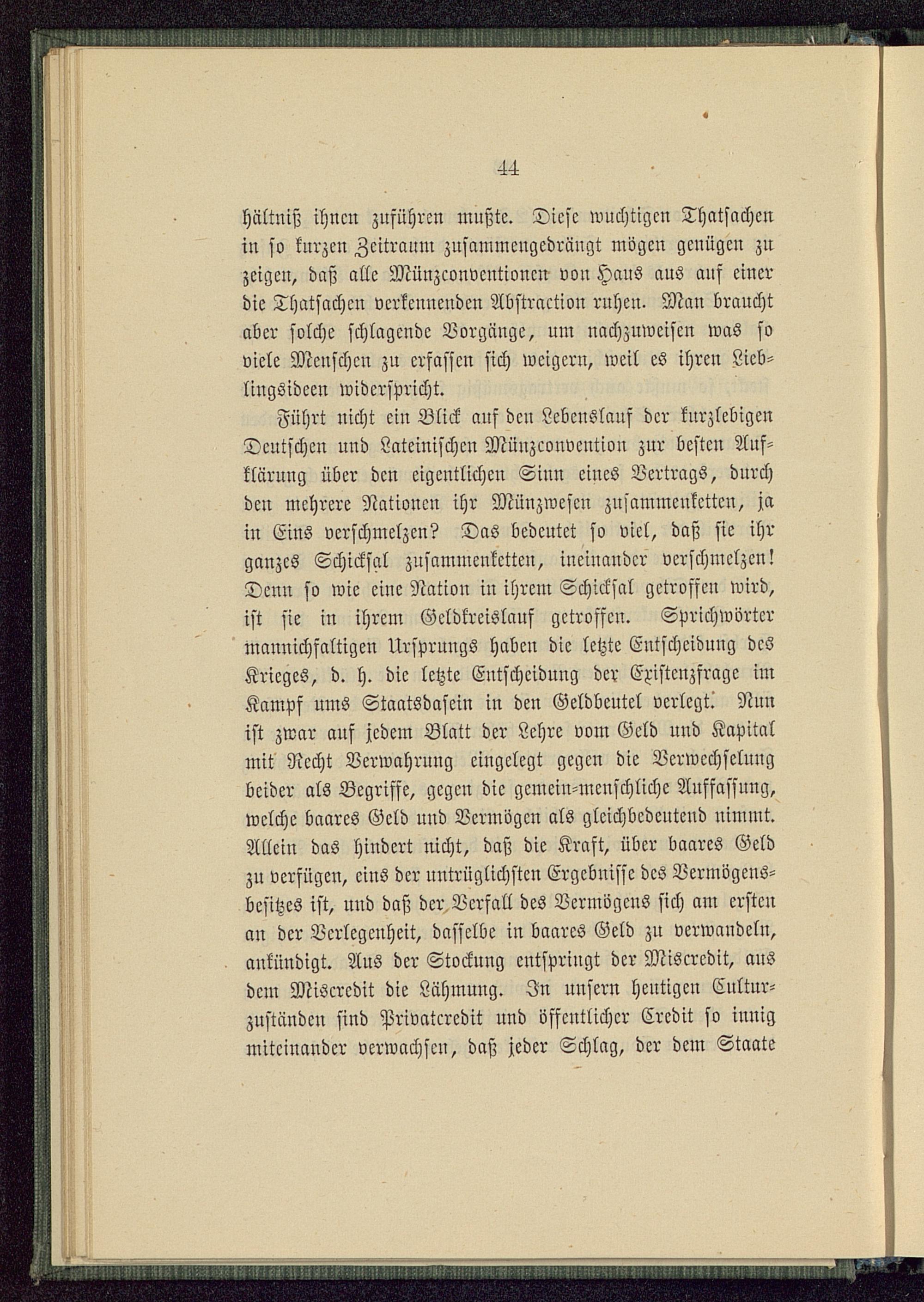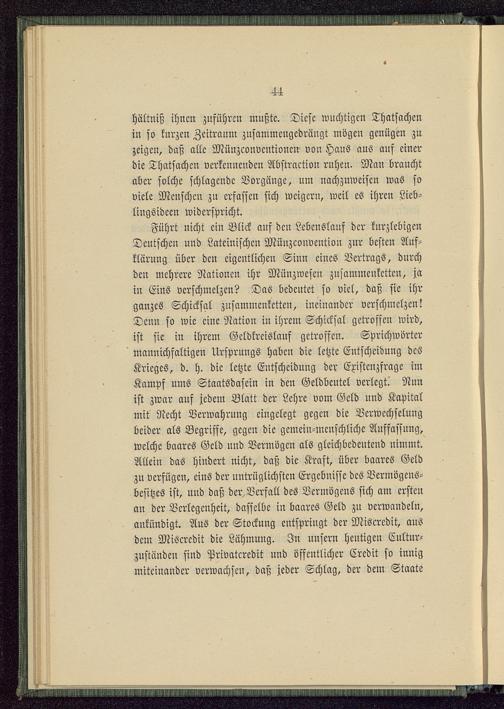 Führt nicht ein Blick auf den Lebcnslanf der knrzlcbigenDeutschen und Lateinischen Münzconvcntion znr besten Auf-klärung über den eigentlichen Sinn eines Vertrags, durchden mehrere Nationen ihr Münzwescu zusammenketten, jain Eins verschmelzen? Das bedeutet so viel, daß sie ihrganzes Schicksal zusammenketten, ineinander verschmelzen!Denn so wie eine Nation in ihrem Schicksal getroffen wird,ist sie in ihrem Gcldkreislauf getroffen. Sprichwörtermannichfaltigen Ursprungs haben die letzte Entscheidung desKrieges, d. h. die letzte Entscheidung der Existenzfrage imKampf ums Staatsdascin in den Geldbeutel verlegt.' Nunist zwar aus jedem Blatt der Lehre vom Geld und Kapitalmit Recht Verwahrung eingelegt gegen die Verwechselungbeider als Begriffe, gegen die gemein-menschliche Auffassung,welche baares Geld uud Vermögen als gleichbedeutend nimmt.Allein das hindert nicht, daß die Kraft, über baares Geldzu verfügen, eins der untrüglichsten Ergebnisse des Vermögens-besitzcs ist, uud daß der Verfall des Vermögens sich am erstenan der Verlegenheit, dasselbe in baares Geld zn verwandeln,ankündigt. Aus der Stockung entspringt der Miscrcdit, ausdem Miscrcdit die Lähmung. In unsern hcutigcu Cultur -zuständcn sind Privatcrcdit und öffcntlichcr Credit so innigmiteinander verwachsen, daß jeder Schlag, der dem Staate