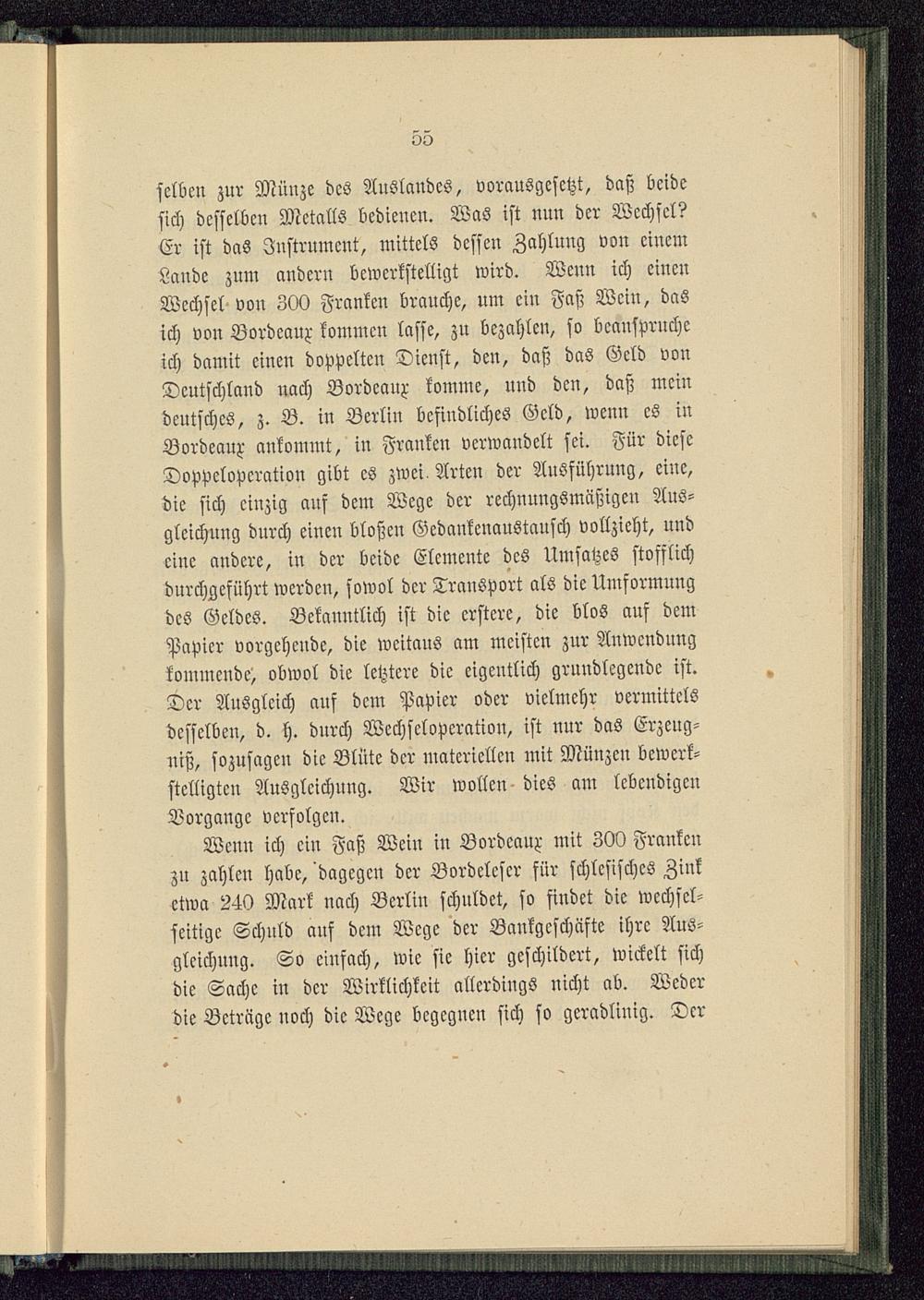 selben zur Münze des Auslandes, vorausgesetzt, daß beidesich desselben Metalls bedienen. Was ist nun der Wechsel?Er ist das Instrument, mittels dessen Zahlung von einemLande zum andern bewerkstelligt wird. Wenn ich einenWechsel von 300 Franken brauche, um ein Faß Wein, dasich von Bordeaux kommen lasse, zn bezahlen, so beansprucheich damit einen doppelten Dienst, den, daß das Geld vonDeutschland nach Bordeaux komme, und den, daß meindeutsches, z. B. in Berlin befindliches Geld, wenn es inBordeaux ankommt, in Franken verwandelt sei. Für dieseDoppclopcration gibt es zwei Arten der Ausführung, eiue,die sich einzig auf dem Wege der rechnungsmäßige» Aus-gleichung durch einen bloßen Gedankenaustausch vollzieht, undeine andere, in der beide Elemente des Umsatzes stofflichdurchgeführt werden, sowol der Transport als die Umformungdes Geldes. Bekanntlich ist die erstere, die blos auf demPapier vorgehende, die weitaus am meisten zur Anwendungkommende, obwol die letztere die eigentlich grundlegende ist.Der Ausgleich auf dem Papier oder vielmehr vermittelsdesselben, d. h. durch Wcchsclopcratiou, ist nur das Erzeng-uiß, sozusagen die Blüte der materiellen mit Müuzcu bewerk-stelligten Ausgleichung. Wir wollen dies am lebendigenVorgänge verfolgen.