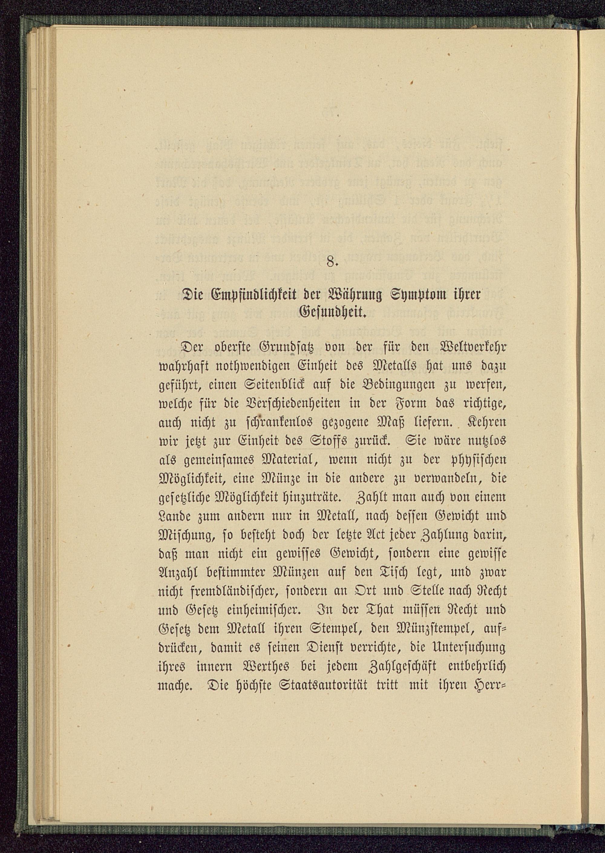 Der oberste Grundsatz von der für den Weltverkehrwahrhaft nothwendigen Einheit des Metalls hat uns dazugeführt, einen Seitenblick auf die Bedingungen zu werfen,welche für die Verschiedenheiten in der Form das richtige,auch nicht zu schrankenlos gezogene Maß liefern. Kehrenwir jetzt zur Einheit des Stoffs zurück. Sie wäre nutzlosals gemeinsames Material, wenn nicht zu der physischenMöglichkeit, eine Münze in die andere zu verwandeln, diegesetzliche Möglichkeit hinzuträte. Zahlt man anch von einemLande zum andern nur in Metall, nach dessen Gewicht undMischung, so besteht doch der letzte Act jeder Zahlung darin,daß man nicht ein gewisses Gewicht, sondern eine gewisseAnzahl bestimmter Münzen auf den Tisch legt, und zwarnicht fremdländischer, sondern an Ort und Stelle nach Rechtund Gesetz einheimischer. In der That müssen Recht undGesetz dem Metall ihren Stempel, den Mllnzstempel, auf-drücken, damit es seinen Dienst verrichte, die Untersuchungihres innern Werthes bei jedem Zahlgeschäst entbehrlichmache. Die höchste Staatsautorität tritt mit ihren Herr-