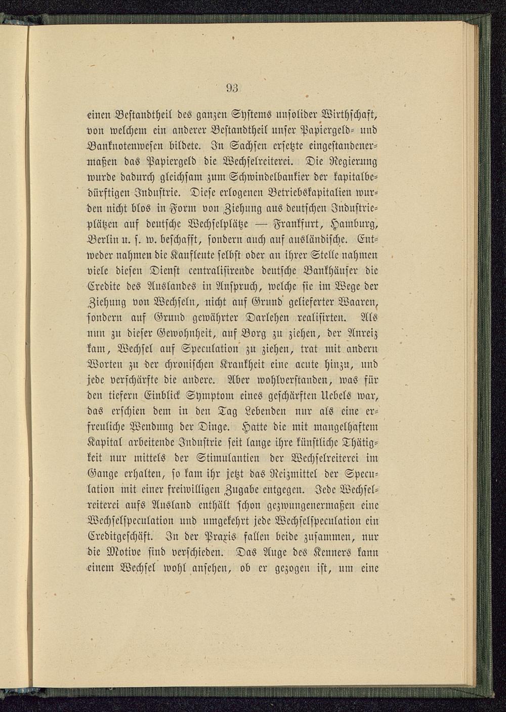 «inen Bestandtheil des ganzen Systems unsolider Wirthschaft,von welchem ein anderer Bestandtheil unser Papiergeld- undBanknotcnwcscn bildete. In Sachsen ersetzte eingestandener-maßen das Papiergeld die Wechselreiterei. Die Regierungwurde dadurch gleichsam zum Schwiudclbankier der kapitalbc-dürftigcn Industrie. Diese erlogeucu Betriebskapitalien wur-den nicht blos in Form von Ziehuug aus deutschen Jndustrie-plätzcn auf deutsche Wcchsclplätze — Frankfurt, Hamburg ,Berlin u. s. w. beschafft, sondern auch aus ausländische. Ent-weder nahmen die Kaufleute selbst oder an ihrer Stelle nahmenviele diesen Dienst ccntralisircndc deutsche Bankhäuser dieCredite des Auslandes in Anspruch, welche sie im Wege derZiehuug von Wechseln, nicht auf Grund gelieferter Waaren,fondcrn auf Grund gewährter Darlehen rcalisirten. Alsnun zu dieser Gewohnheit, auf Borg zu ziehen, der Anreizkam, Wechsel auf Speculation zu ziehen, trat mit andernWorten zu der chronischcu Krankheit eine acute hinzu, undjede verschärfte die andere. Aber wohlverstanden, waö fürden tiefern Einblick Symptom eines geschärften Uebels war,das erschien dem in den Tag Lebenden mir als eine er-freuliche Wendung der Dinge. Hatte die mit mangelhaftemKapital arbeitende Industrie seit lange ihre künstliche Thätig-keit nur mittels der Stimulantien der Wechselreiterei imGange erhalten, so kam ihr jetzt das Reizmittel der Specu-lation mit einer freiwilligen Zugabc entgegen. Jede Wechsel-reiterei aufs Ausland enthält schon gezwungenermaßen eineWcchselspcculation und umgekehrt jede Wcchsclspcculatiou ciuCreditgeschäft. In dcr Praxis fallen beide zusammen, nurdie Motive sind verschieden. Das Auge des Kenners kanneinem Wechsel wohl ansehen, ob er gezogen ist, um eiue