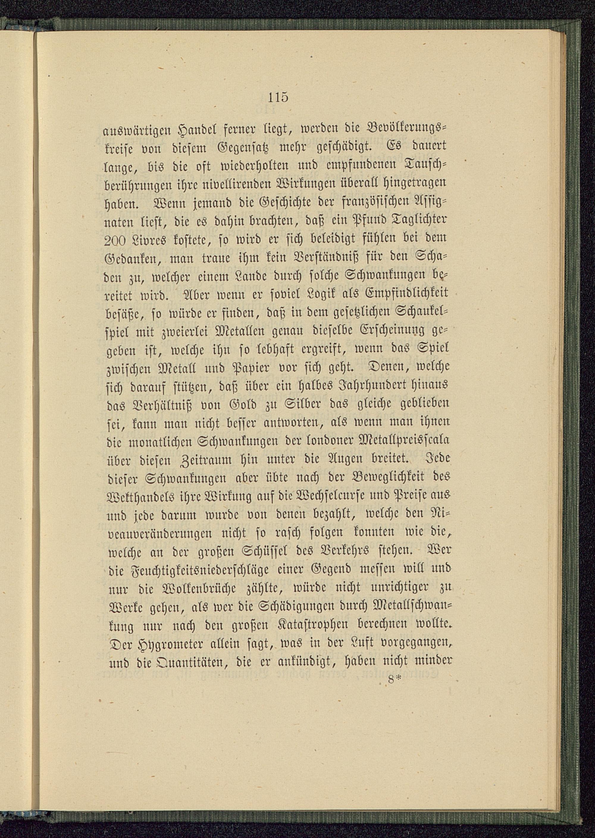 auswärtigen Handel ferner liegt, werden die Bcvölkcruugs-krcise von diesem Gegensatz mehr geschädigt. Es dauertlange, bis die oft wiederholten und empfuudcucn Tausch-berührungeu ihre nivcllirenden Wirkungen überall hingetragenhaben. Wenn jemand die Geschichte der französischen Assig-naten liest, die es dahin brachten, daß ein Pfuud Taglichter200 Livrcs kostete, so wird er sich beleidigt fühlen bei demGedanken, man traue ihm kein Verständniß für den Scha-den zu, welcher einem Lande durch solche Schwankungen be-reitet wird. Aber wen» er soviel Logik als Empfindlichkeitbesäße, so würde er finden, daß in dem gesetzlichen Schankcl-spiel mit zweierlei Metallen genau dieselbe Erscheinung ge-geben ist, welche ihn so lebhaft ergreift, wenn das Spielzwischen Metall und Papier vor sich geht. Denen, welchesich darauf stützen, daß über ein halbes Jahrhundert hinausdas Verhältniß von Gold zu Silber das gleiche gebliebensei, kann man nicht besser antworten, als wenn man ihnendie monatlichen Schwankungen der londoner Mctallprcisscalaüber diesen Zeitraum hiu unter die Augen breitet. Jededieser Schwankungen aber übte nach der Beweglichkeit desWelthandels ihre Wirkung auf die Wcchselcurse und Preise ausund jede darum wurde von denen bezahlt, welche den Ni-vcauvcrändcruugcu nicht so rasch folgen konnten wie die,welche an der großen Schüssel des Verkehrs stehen. Werdie Fenchtigkcitsnicdcrschläge einer Gegend messen will undnur die Wolkcubrüchc zählte, würde nicht unrichtiger znWerke gchcu, als wer die Schädiguugcu durch Mctallschwan-knng nnr nach den großen Katastrophen berechnen wollte.Der Hygrometer allein sagt, was in der Luft vorgegangen,und die Quantitäten, die er ankündigt, haben nicht minder