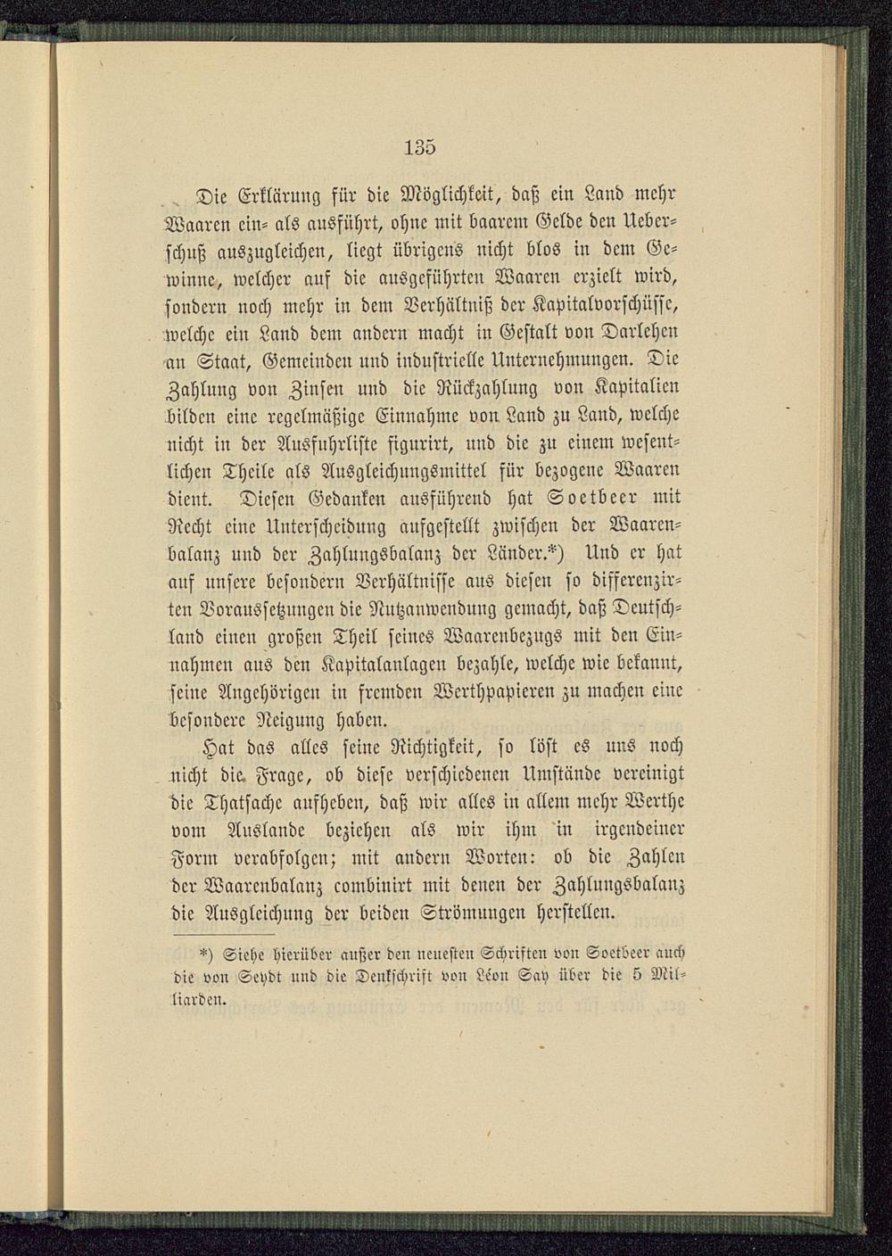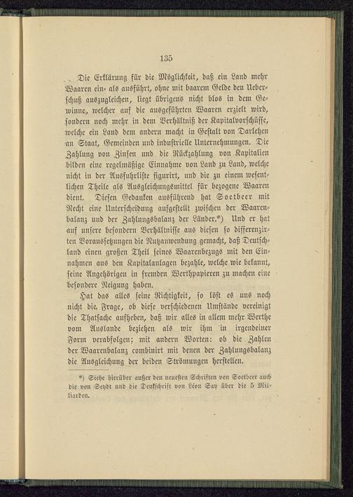 Die Erklärung für die Möglichkeit, daß ein Land mehrWaaren ein- als ausführt, ohne mit baarcm Gelde den Über-schuß auszugleichen, liegt übrigcus nicht blos in dem Ge-winne, welcher auf die ausgeführten Waaren erzielt wird,sondern noch mehr in dem Verhältniß der Kapitalvorschüssc,welche ein Land dem andern macht in Gestalt von Darlehenan Staat, Gemeinden und industrielle Unternehmungen. DieZahlung von Zinsen und die Rückzahlung von Kapitalienbilden eine regelmäßige Einnahme von Land zu Land, welchenicht in der Ansfnhrlistc figurirt, nnd die zu einem wesent-lichen Theile als Ausgleichungsmittel für bezogene Waarendient. Diesen Gedanken ausführend hat Soetbecr mitRecht eine Unterscheidung aufgestellt zwischen der Waarcn-balanz und der ZahlungSbalanz der Länder.^) Und er hatauf unsere besondern Verhältnisse aus diesen so diffcrenzir-ten Voraussetzungen die Nutzanwendung gemacht, daß Deutsch-land einen großen Theil seines Waarcnbezngs mit den Ein-nahmen ans den Kapitalanlagen bezahle, welche wie bekannt,seine Angehörigen in fremden Wertpapieren zu machen einebesondere Neigung haben.