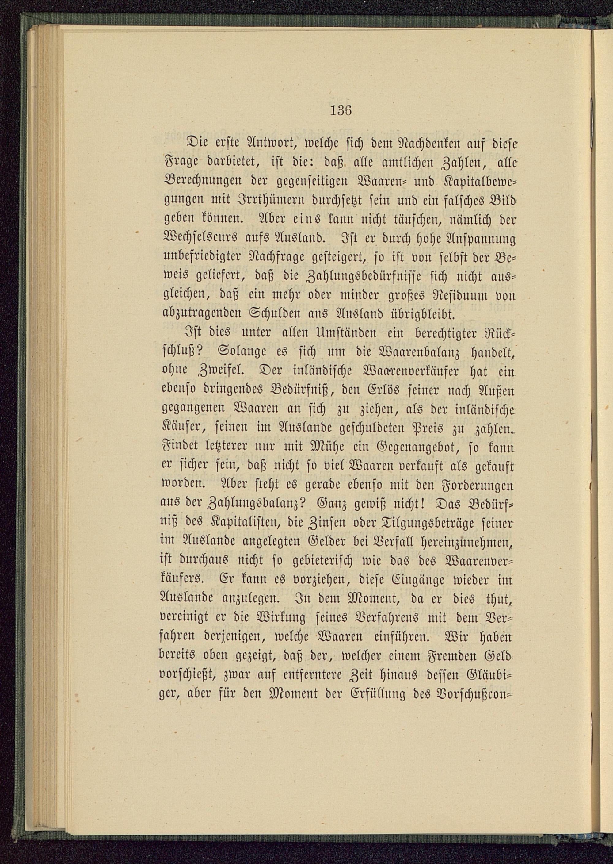 Ist dies unter allen Umständen ein berechtigter Rück-schluß? Solange es sich um die Waareubalauz handelt,ohne Zweifel. Der inländische Waa-rcnvcrkänfcr hat einebenso dringendes Bedürfniß, den Erlös seiner nach Außengegangenen Waaren an sich zu ziehen, als der inländischeKäufer, seinen im Auslande geschuldeten Preis zu zahlen.Findet letzterer nur mit Mühe ein Gegenangebot, so kanner sicher sein, daß nicht so viel Waaren verkauft als gekauftwordcu. Aber steht es gerade ebenso mit den Forderungenaus der ZahlnngSbalanz? Ganz gewiß nicht! Das Bedürf-niß des Kapitalisten, die Zinsen oder TilgungSbcträge seinerim Auslande angelegten Gelder bei Verfall hereinzunehmen,ist durchaus uicht so gebieterisch wie das des Waarcnvcr-käufcrs. Er kann es vorziehen, diese Eingänge wieder imAuslande anzulegen. In dem Moment, da er dies thnt,vereinigt er die Wirkuug seines Verfahrens mit dem Ver-fahren derjenigen, welche Waaren einführen. Wir habenbereits oben gezeigt, daß der, welcher einem Fremden Geldvorschießt, zwar aus entferntere Zeit hinaus dcsscu Gläubi-ger, aber für den Moment der Erfüllung des Vorschußcon-