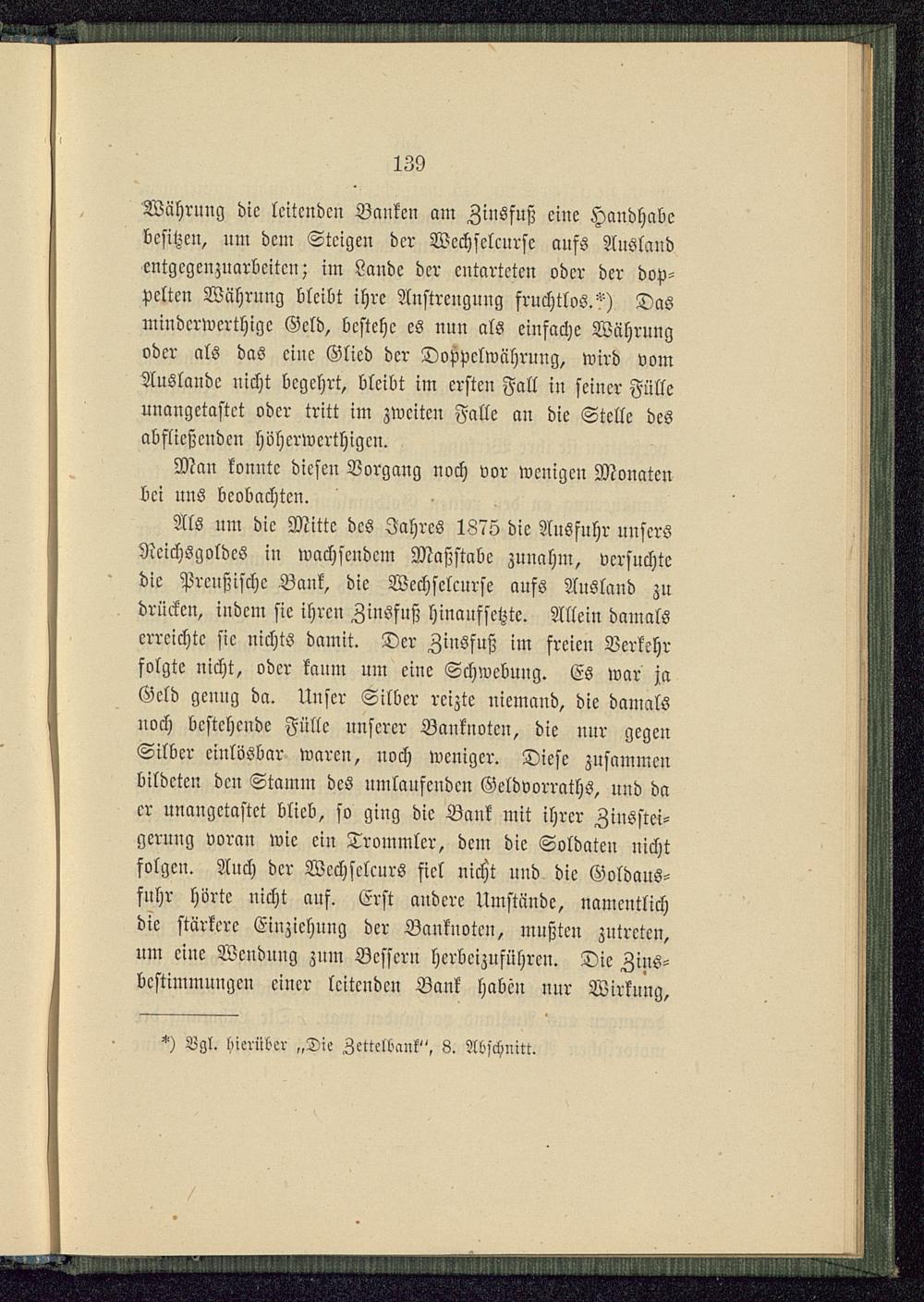 Als um dic Mitte dcs Jahres 1875 die Ausfuhr unsersNcichsgoldcs iu wachscudcm Maßstabe zunahm, versuchtedic Preußische Bank , die Wechsclcurse aufs Ausland zudrücken, indcm sie ihren Zinsfuß hinaufsetzte. Allein damalserreichte sie nichts damit. Der Zinsfuß im freien Verkehrfolgte nicht, oder kanm um eine Schwcbung. Es war jaGeld genug da. Uuscr Silber reizte niemand, die damalsnoch bestehende Fülle unserer Banknoten, die nnr gegenSilber cinlösbar waren, noch weniger. Diese zusammenbildeten dcn Stamm des umlaufenden Geldvorrates, und daer unangetastet blieb, so ging dic Bank mit ihrer Zinsstei-gcrung voran wic cin Trommler, dem die Soldaten nichtfolgen. Anch dcr Wcchsclcurs fiel nicl)t und die Goldaus-fuhr hörte nicht auf. Erst andere Umstände, namentlichdie stärkere Einziehung der Banknoten, mußten zutreten,um eine Wendung zum Bessern herbeizuführen. Die Zins-bcstimmungen einer lcitcndcn Bank haben nnr Wirkung,