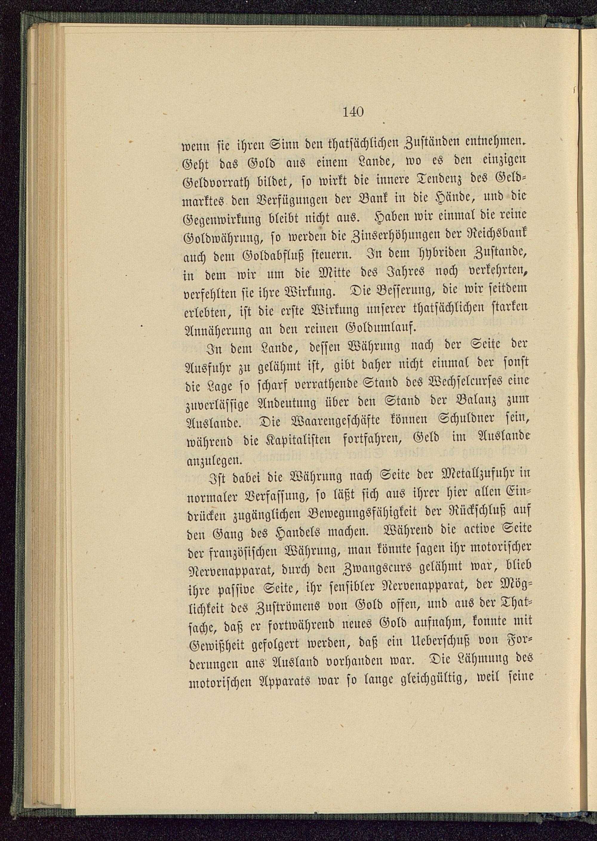 Ist dabei die Währung nach Seite der Mctallzusuhr innormaler Verfassung, so läßt sich aus ihrer hier allen Ein-drücken zugänglichen Bcwcgungsfähigkcit der Rückschluß aufdcn Gang des Handels machen. Während die active Seiteder französischen Währung, man könnte sagen ihr motorischerNcrvenapparat, durch dcn Zwangscurs gelähmt war, blicbihre passive Seite, ihr sensibler Ncrvcnapparat, der Mög-lichkeit des Zuströmcns von Gold offen, und aus der That-sache , daß er fortwährend neues Gold aufnahm, konnte mitGewißheit gefolgert werden, daß ein Ucberschuß vou For-derungen ans Ausland vorhanden war. Die Lähmung desmotorischen Apparats war so lange gleichgültig, weil seine