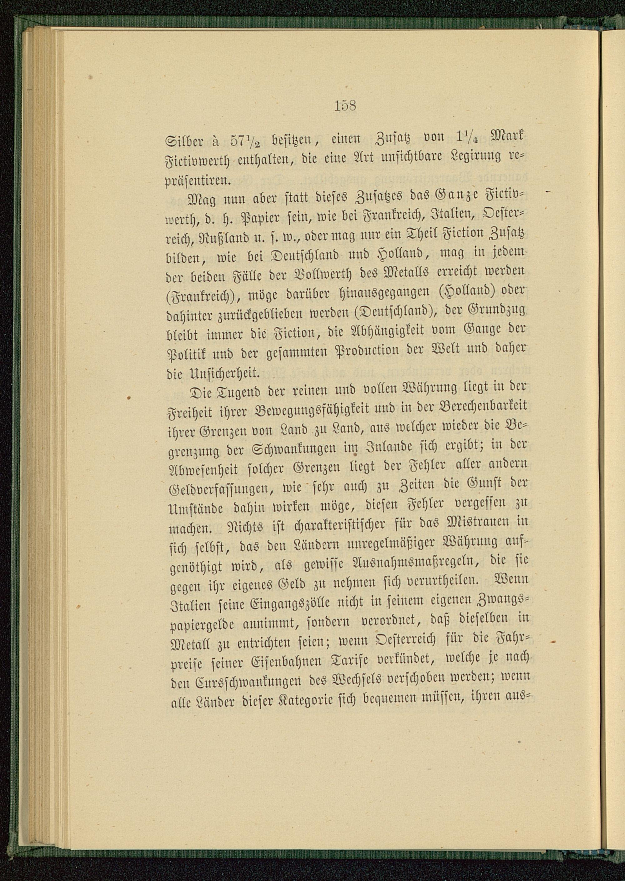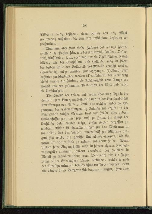 Die Tugend der reinen und vollen Währung liegt in derFreiheit ihrer Bewcguugsfähigkcit uud in der Bcrcchcubarkcitihrer Grenzen von Land zu Land, ans welcher wieder die Be-grenzung der Schwankungen im Jnlandc sich ergibt; in derAbwesenheit solcher Grenzen liegt der Fehler aller andernGeldvcrfassnngcn, wie sehr anch zu Zeiten die Gunst derUmstände dahiu wirken möge, diesen Fehler vergessen zumachen. Nichts ist charakteristischer für daö Mistraucn insich selbst, das den Ländern unregelmäßiger Währung auf>genöthigt wird, als gewisse Ausnahmsmaßrcgcln, die siegegen ihr eigenes Geld zu nehmen sich vcrurthcilcn. WennItalien seine Eingangszöllc nicht in seinem eigenen Zwaugs-vavicrgcldc annimmt, sondern verordnet, daß dieselben inMetall zu cutrichten seien; wenn Oesterreich für die Fahr-preise seiner Eisenbahnen Tarife verkündet, welche je nachdcu Cnrsschwankuugcü dcs Wechsels verschoben werden; wennalle Länder dieser Kategorie sich bequemen müssen, ihren aus-