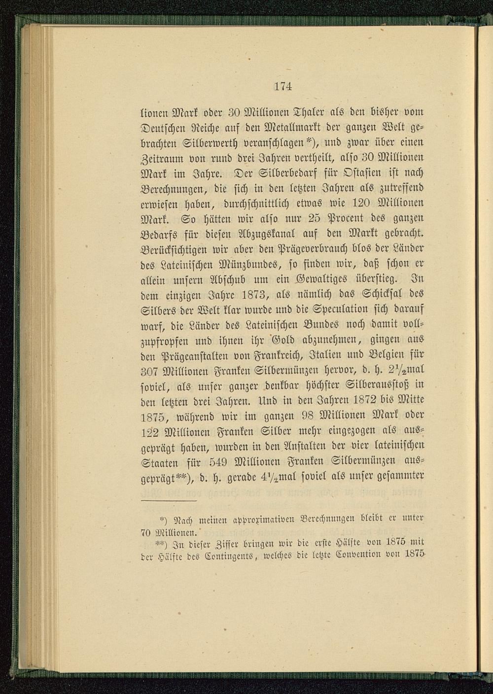 lioncn Mark oder 30 Millionen Thalcr als dcn bisher vomDeutschen Reiche ans dcn Mctallmarkt der ganzen Welt ge-brachten Silberwerth veranschlagen"), und zwar über einenZeitraum von rund drei Jahren vertheilt, also 30 MillionenMark im Jahre. Der Silbcrbedarf für Ostasien ist nachBerechnungen, die sich in den letzten Jahren als zutreffenderwiesen haben, durchschnittlich etwas wie 120 MillionenMark. So hätten wir also nur 25 Procent des ganzenBedarfs für diesen Abzngskanal auf den Markt gebracht.Berücksichtigen wir aber den Prägcverbranch blos der Länderdes Lateinischen Münzbnndes, so finden wir, daß schon erallein unsern Abschub um ein Gewaltiges überstieg. Indem einzigen Jahre 1873, als nämlich das Schicksal desSilbers der Welt klar wurde und die Speculation sich daraufwarf, die Länder des Lateinischen Bundes noch damit voll-zupfropfen und ihnen ihr 'Gold abzunehmen, giugcn ansdcn Prägcanstalten von Frankreich, Italien und Belgien für307 Millionen Franken Silbcrmünzen hervor, d. h. 2V2walsoviel, als nnscr ganzer denkbar höchster Silbcrausstoß indcn letzten drei Jahren. Und in dcn Jahren 1872 bis Mitte1875, während wir im ganzen 98 Millionen Mark oder122 Millionen Franken Silber mehr eingezogen als aus-geprägt haben, wurden in den Anstalten der vier lateinischenStaaten für 549 Millionen Franken Silbermüuzcn aus-geprägt""), d. h. gerade 4'/-Mal soviel als uuscr gesammtcr