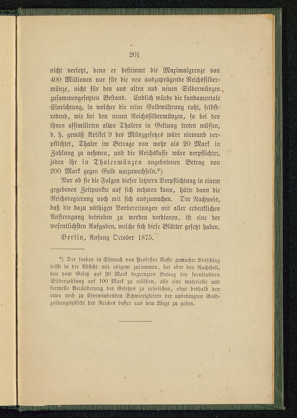 5) Der soeben in Eisenach von Professor Nasse gemachte Vorschlagtrifft in der Absicht mit obigem zusammen, hat aber den Nachtheil,den vom Gesetz auf 20 Mark begrenzten Betrag der facultativenSilbcrzahlnng auf ZVi) Mark zu erhöhen, also eine materielle undformelle Veränderung des Gesetzes zn erheischen, ohne deshalb denetwa noch zu überwindenden Schwierigkeiten der unbedingten Gold-zahluugspflicht des Reiches besser aus dem Wege zu gehen.