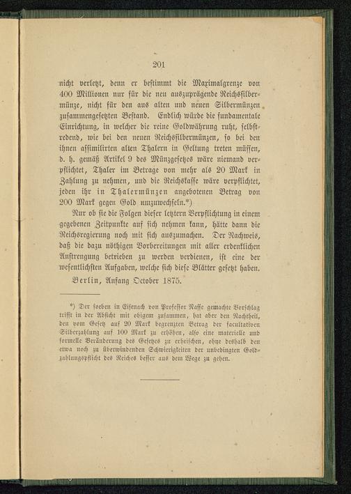 nicht verletzt, denn er bestimmt die Maximalgrenze von400 Millionen nur für die neu auszuprägende Reichssilber-münze, nicht für den aus alten und neuen Silbermünzen,zusammengesetzten Bestand. Endlich würde die fundamentaleEinrichtung, in welcher die reine Goldwährung ruht, selbst-redend, wie bei den neuen Reichssilbermünzen, so bei denihnen assimilirten alten Thalern in Geltung treten müssen,d. h. gemäß Artikel 9 des Münzgesetzes wäre niemand ver-pflichtet, Thaler im Betrage von mehr als 20 Mark inZahlung zu nehmen, und die Reichskassc wäre verpflichtet,jeden ihr in Thalcrmünzen angebotenen Betrag von200 Mark gegen Gold umzuwechseln.^)