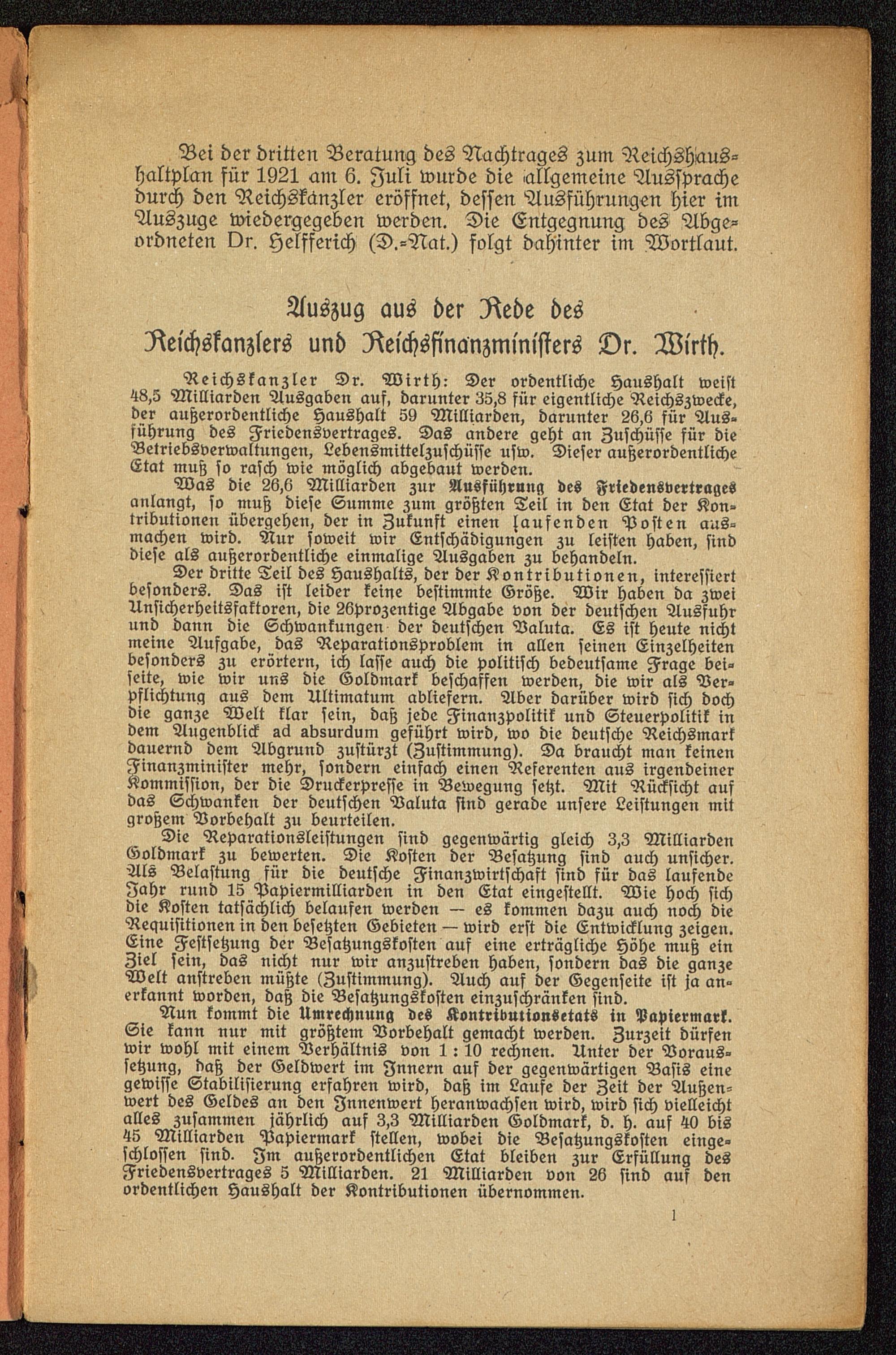 Auszug aus der Rede desReichskanzlers und Reichsfinanzminisiers Or. Wirth.