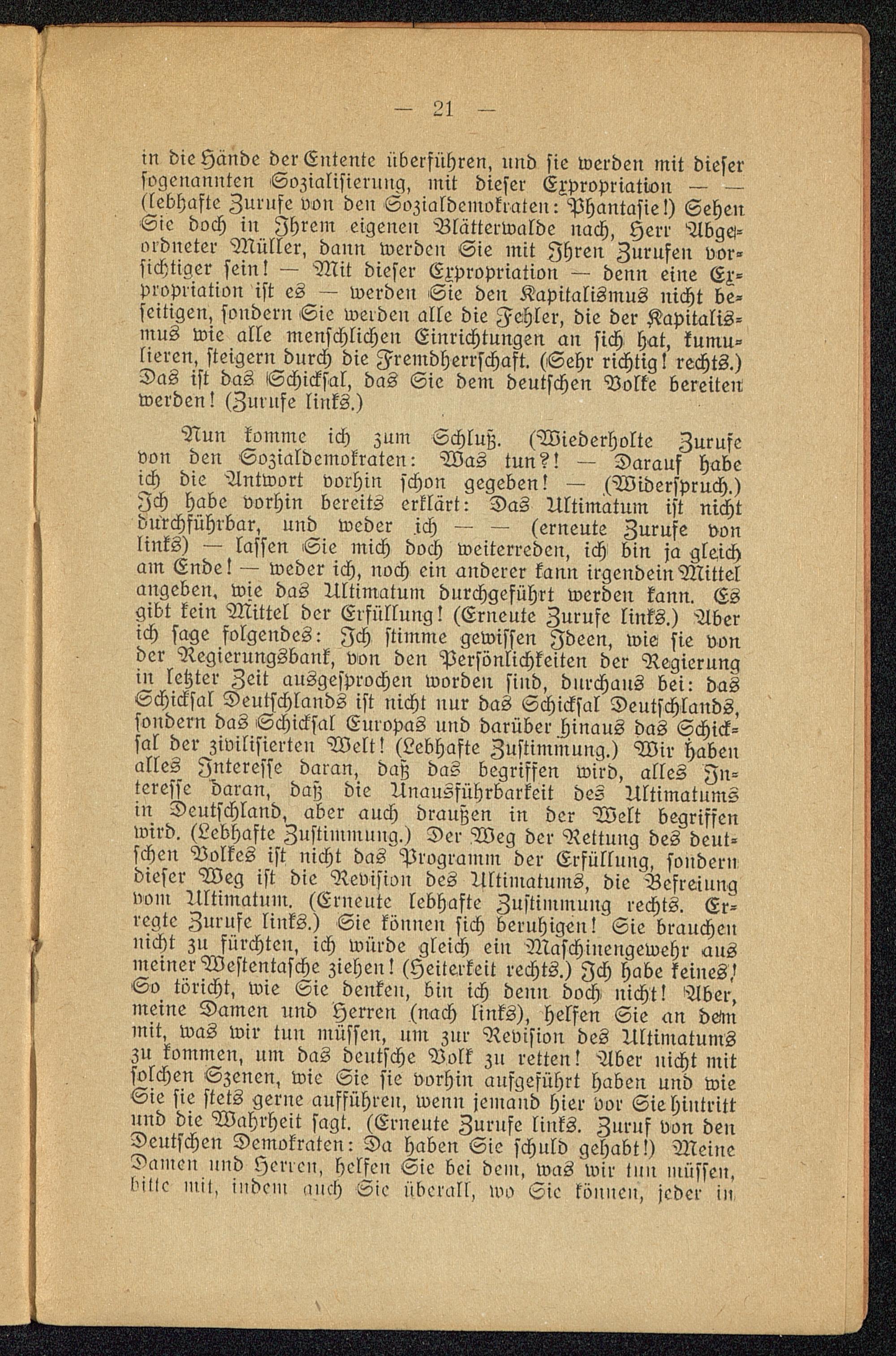 Nun komme ich zum Schluß. (Wiederholte Zurufevon den Sozialdemokraten: Was tun?! — Darauf habeich die Antwort vorhin schon gegeben! — (Widerspruch.)Ich habe vorhin bereits erklärt: Das Ultimatum ist nichtdurchführbar, und weder ich ^ ^ (erneute Zurufe vonlinks) ^ lassen Sie mich doch weiterreden, ich bin ja gleicham Ende! — weder ich, noch ein anderer kann irgendein Mittelangeben, wie das Ultimatum durchgeführt werden kann. Esgibt kein Mittel der Erfüllung! (Erneute Zurufe links.) Aberich sage folgendes: Ich stimme gewissen Ideen, wie sie vonder Regierungsbank, von den Persönlichkeiten der Regierungin letzter Zeit ausgesprochen worden sind, durchaus bei: dasSchicksal Deutschlands ist nicht nur das Schicksal Deutschlands ,sondern das Schicksal Europas und darüber hinaus das Schick-sal der zivilisierten Welt! (Lebhafte Zustimmung.) Wir habenalles Interesse daran, daß das begriffen wird, alles In-teresse daran, daß die Unausführbarkeit des Ultimatumsin Deutschland , aber auch draußen in der Welt begriffenwird. (Lebhafte Zustimmung.) Der Weg der Rettung des deut-scheu Volkes ist nicht das Programm der Erfüllung, sonderndieser Weg ist die Revision des Ultimatums, die Befreiungvom Ultimatum. (Erneute lebhafte Zustimmung rechts. Er-regte Zurufe links.) Sie können sich beruhigen! Sie brauchennicht zu fürchteu, ich würde gleich ein Maschinengewehr ausmeiner Westentasche ziehen! (Heiterkeit rechts.) Ich habe keines)So töricht, wie Sie denken, bin ich denn doch, nicht! Aber,meine Damen und Herren (nach links), helfen Sie an detmmit, was wir tun müssen, um zur Revision des Ultimatumszu kommen, um das deutsche Volk zu retten! Aber nicht mitsolchen Szenen, wie Sie sie vorhin anfgeführt haben und wieSie sie stets gerne aufführen, wenn jemand hier vor Sie hintrittnnd die Wahrheit sagt. (Erueute Zurufe links. Zuruf von denDeutschen Demokraten: Da haben Sie schuld gehabt!) MeineDamen und Herren, helfen Sie bei dem, was wir tun müssen,l'illc mit, indem auch Sie überall, wo Sie können, jeder in
