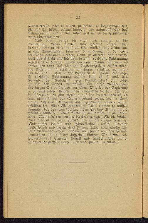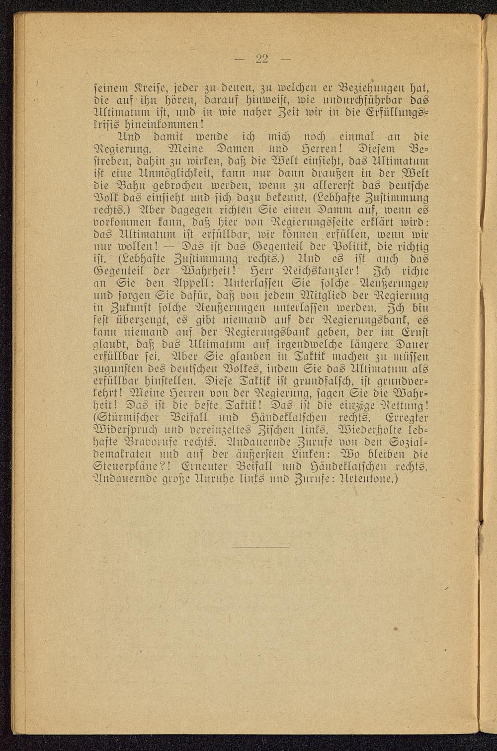 Und damit wende ich mich noch einmal an dieRegierung. Meine Damen Und Herren! Diesem Be-streben, dahin zu wirken, das; die Welt einsieht, das Ultimatumist eine Unmöglichkeit, kann nur dann draußeu in der Weltdie Bahn gebrochen werden, wenn zu allererst das deutscheVolk das einsieht und sich dazu bekennt. (Lebhafte Zustimmungrechts.) Aber dagegen richten Sie einen Damm auf, wenu esvorkommen kann, daß hier von Regierungsseite erklärt wird:das Ultimatum ist erfüllbar, wir köuuen erfüllen, wenn wirnur wolleu! — Das ist das Gegenteil der Politik, die richtigist. (Lebhafte Zustimmung rechts.) Und es ist anch dasGegenteil der Wahrheit! Herr Reichskanzler! Ich richteau Sie den Appell: Unterlassen Sie solche Aenßernnge»nnd sorgen Sie dafür, daß von jedem Mitglied der Regierungiu Zukunft solche Aeußerungen unterlassen werden. Ich binfest überzeugt, es gibt niemand ans der Regiernngsbank, leskann niemand auf der Regiernngsbank geben, der im Ernstglaubt, daß das Ultimatum auf irgendwelche längere Dauererfüllbar sei. Aber Sie glauben in Taktik machen zn müssen,zugunsten des dentscheu Volkes, indem Sie das Ultimatum alserfüllbar hinstellen. Diese Taktik ist grundfalsch, ist grnndver-kehrt! Meine Herreu von der Regierung, sagen Sie die Wahr-heit! Das ist die beste Taktik! Das ist die einzige Rettung!(Stürmischer Beifall nnd Händeklatschen rechts. ErregterWiderspruch und vereinzeltes Zischen links. Wiederholte leb-hafte Bravorufe rechts. Andauernde Znrnfe von den Sozial-demakratcu und ans der äußersten Liukeu: Wo bleiben dieSteuerpläne?! Erneuter Beifall und Händeklatschen rechts.Andauernde große Unrnhc links nnd Znrnfe: Urteutone.)