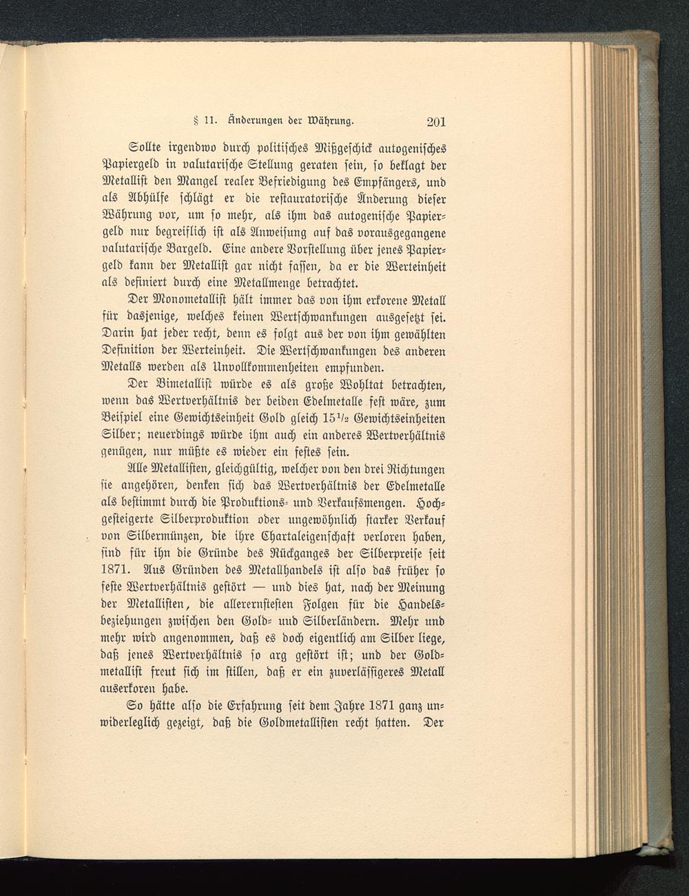 Der Bimetallist würde es als große Wohltat betrachten,wenn das Wertverhältnis der beiden Edelmetalle fest wäre, zumBeispiel eine Gewichtseinheit Gold gleich 15^/2 GewichtseinheitenSilber; neuerdings würde ihm auch ein anderes Wertverhältnisgenügen, nur müßte es wieder ein festes sein.