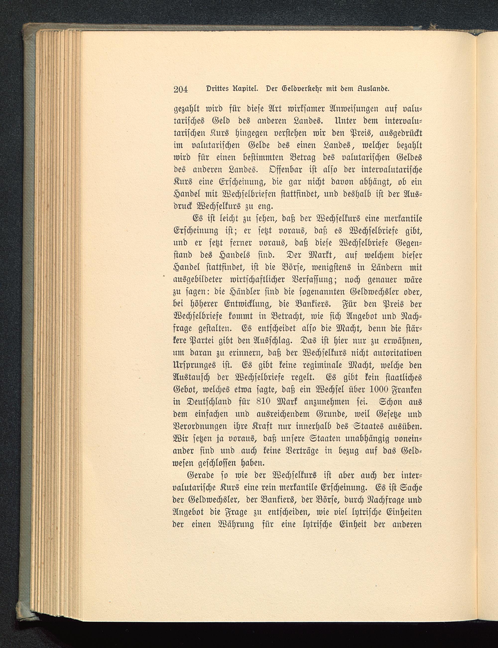 Es ist leicht zu sehen, daß der Wechselkurs eine merkantileErscheinung ist; er setzt voraus, daß es Wechselbriefe gibt,und er setzt ferner voraus, daß diese Wechselbriefe Gegen-stand des Handels sind. Der Markt, auf welchem dieserHandel stattfindet, ist die Börse, wenigstens in Ländern mitausgebildeter wirtschaftlicher Verfassung; noch genauer wärezu sagen: die Händler sind die sogenannten Geldwechsler oder,bei höherer Entwicklung, die Bankiers. Für den Preis derWechselbriefe kommt in Betracht, wie sich Angebot und Nach-frage gestalten. Es entscheidet also die Macht, denn die stär-kere Partei gibt den Ausschlag. Das ist hier nur zu erwähnen,um daran zu erinnern, daß der Wechselkurs nicht autoritativenUrsprunges ist. Es gibt keine regiminale Macht, welche denAustausch der Wechselbriefe regelt. Es gibt kein staatlichesGebot, welches etwa sagte, daß ein Wechsel über 1000 Frankenin Deutschland für 810 Mark anzunehmen sei. Schon ausdem einfachen und ausreichendem Grunde, weil Gesetze undVerordnungen ihre Kraft nur innerhalb des Staates ausüben.Wir setzen ja voraus, daß unsere Staaten unabhängig vonein-ander sind und auch keine Verträge in bezug auf das Geld-wesen geschlossen haben.