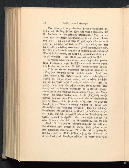 II. Bisher haben wir nur von einem einzigen Gute geredet,dessen Preisveränderungen statistisch untersucht worden wären.Es gibt aber noch eine andere Art solcher Untersuchungen: es wirdeine Reihe von Gütern ausgewählt, die natürlich genannt seinmüssen, zum Beispiel: Weizen, Kohlen, wichtige Metalle wieEisen, Kupfer u. dgl. Man verabredet also einen Komplex vonGütern, wie wir es nennen wollen, und untersucht statistisch,wie sich der Preis dieses Komplexes verändert hat- Ehe diesgeschehen kann, muß aber gesagt werden, welche Mengen jedesGutes, das im Komplex einbegriffen ist, in Betracht gezogenwerden sollen, zum Beispiel: ein Kilogramm Weizen, eine TonneKohlen, ein Pfund Platin usw. Es ist gleichgültig, welcheMengen man von jedem Gute annimmt, aber eine Verabredungüber die Mengen ist durchaus erforderlich, damit der Sinn desKomplexes von Gütern eindeutig bestimmt ist. Wenn dieseEindeutigkeit des Komplexes erreicht ist, kann die statistischeUntersuchung des Preises unseres Komplexes stattfinden, vorheraber nicht. Nun soll für zwei Zeiträume die Untersuchung desPreises statistisch durchgeführt sein; dann erhält man für denersten Zeitraum eine Zahl von Werteinheiten, zum BeispielX; Mark; für den zweiten Zeitraum ebenfalls eine Zahl vonWerteinheiten, zum Beispiel Xz Mark. Diese Zahlen nenntman bekanntlich Indexzahlen. Wenn die spätere Indexzahl,also Xg, größer ist als die frühere, also größer ist als x., soist der Wert jenes Komplexes gestiegen; im umgekehrten Falle