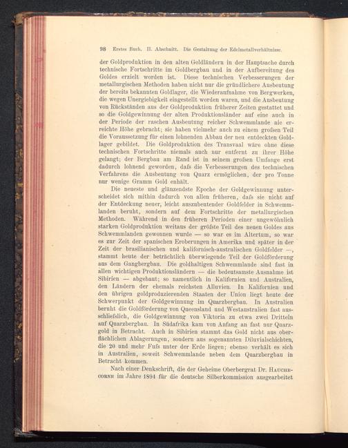 der Goldproduktion in den alten Goldländern in der Hauptsache durchtechnische Fortschritte im Goldbergbau und in der Aufbereitung desGoldes erzielt worden ist. Diese technischen Verbesserungen dermetallurgischen Methoden haben nicht nur die gründlichere Ausbeutungder bereits bekannten Goldlager, die Wiederaufnahme von Bergwerken,die wegen Unergiebigkeit eingestellt worden waren, und die Ausbeutungvon Rückständen aus der Goldproduktion früherer Zeiten gestattet undso die Goldgewinnung der alten Produktionsländer auf eine auch inder Periode der raschen Ausbeutung reicher Schwemmlande nie er-reichte Höhe gebracht; sie haben vielmehr auch zu einem grofsen Teildie Voraussetzung für einen lohnenden Abbau der neu entdeckten Gold-lager gebildet. Die Goldproduktion des Transvaal wäre ohne diesetechnischen Fortschritte niemals auch nur entfernt zu ihrer Höhegelangt; der Bergbau am Rand ist in seinem grofsen Umfange erstdadurch lohnend geworden, dafs die Verbesserungen des technischenVerfahrens die Ausbeutung von Quarz ermöglichen, der pro Tonnenur wenige Gramm Gold enhält.