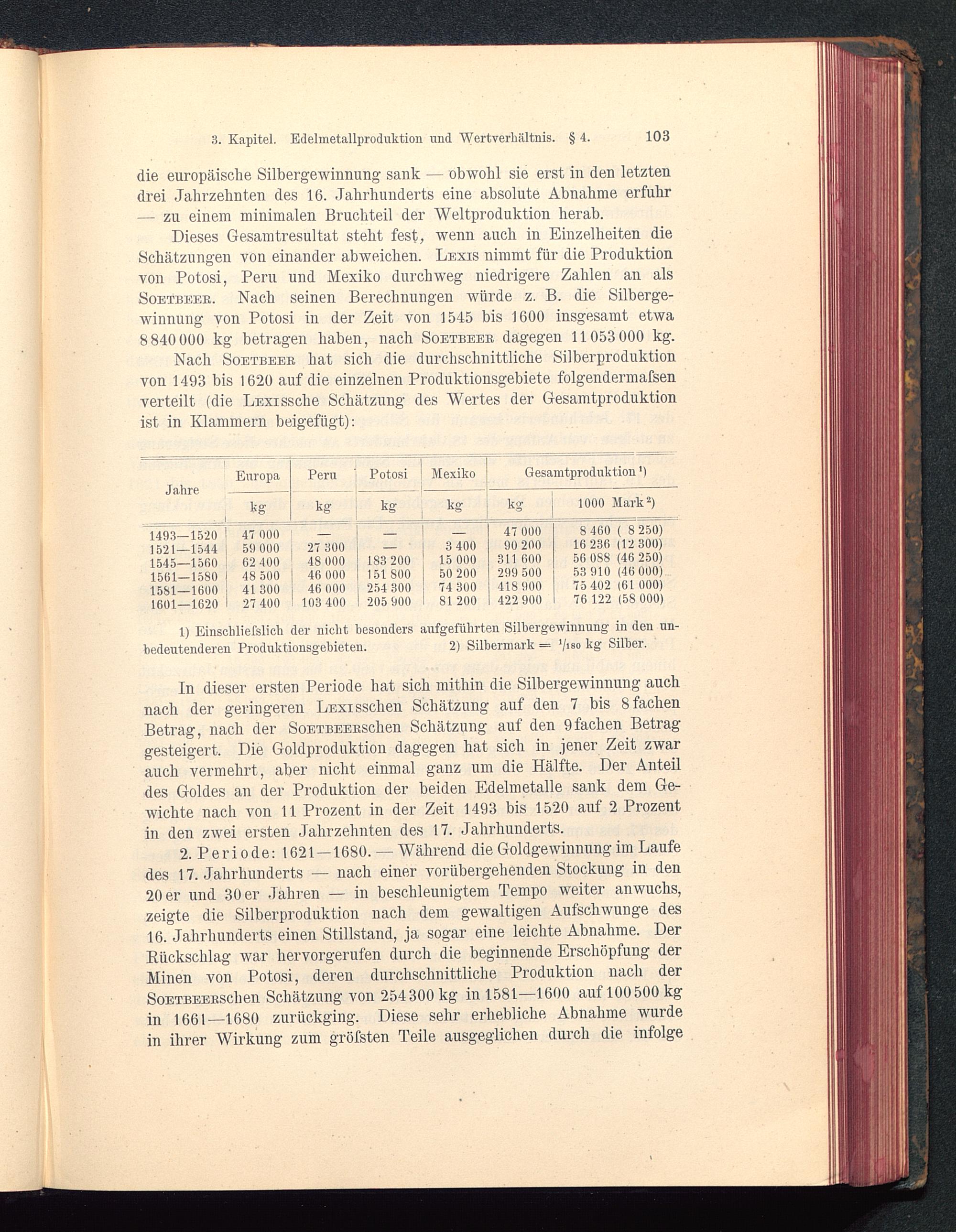 Nach Soetbeeb hat sich die durchschnittliche Silberproduktionvon 1493 bis 1620 auf die einzelnen Produktionsgebiete folgendermafsenverteilt (die LExissche Schätzung des Wertes der Gesamtproduktionist in Klammern beigefügt):