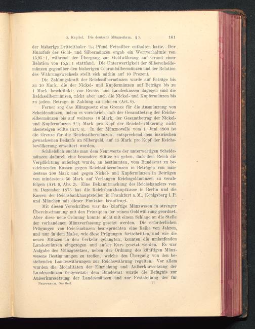 Ferner zog das Münzgesetz eine Grenze für die Ausmünzung vonScheidemünzen, indem es vorschrieb, dafs der Gesamtbetrag der Reichs-silbermünzen bis auf weiteres 10 Mark, der Gesamtbetrag der Nickel-und Kupfermünzen 2. 1 /2 Mark pro Kopf der Reichsbevölkerung nichtübersteigen sollte (Art. 4). In der Münznovelle vom I . Juni 1900 istdie Grenze für die Reichssilbermünzen, entsprechend dem inzwischengewachsenen Bedarfe an Silbergeld, auf 15 Mark pro Kopf der Reichs-bevölkerung erweitert worden.