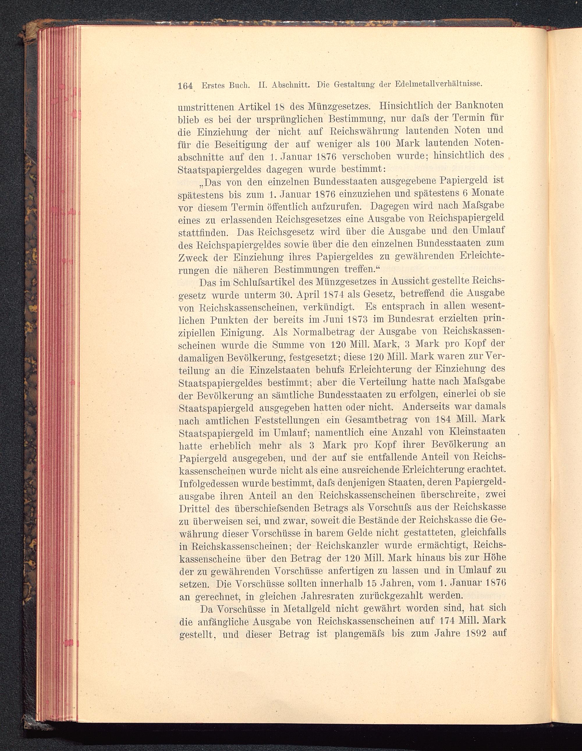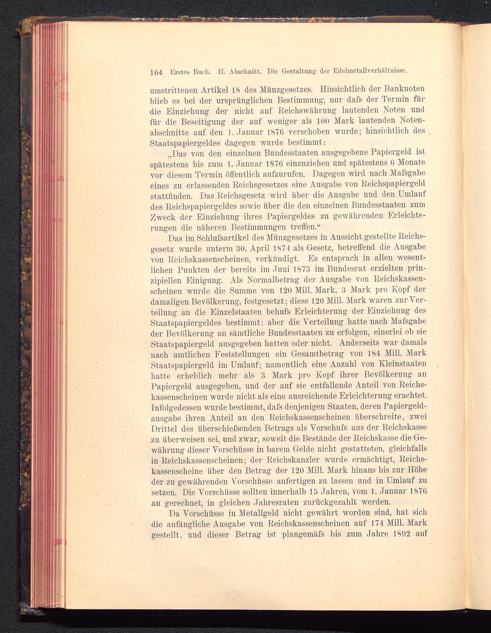 Das im Schlufsartikel des Münzgesetzes in Aussicht gestellte Reichs-gesetz wurde unterm 30. April 1874 als Gesetz, betreffend die Ausgabevon Reichskassenscheinen, verkündigt. Es entsprach in allen wesent-lichen Punkten der bereits im Juni 1873 im Bundesrat erzielten prin-zipiellen Einigung. Als Normalbetrag der Ausgabe von Reichskassen-scheinen wurde die Summe von 120 Mill. Mark. 3 Mark pro Ivopf derdamaligen Bevölkerung, festgesetzt; diese 120 Mill. Mark waren zur Ver-teilung an die Einzelstaaten behufs Erleichterung der Einziehung desStaatspapiergeldes bestimmt; aber die Verteilung hatte nach Mafsgabeder Bevölkerung an sämtliche Bundesstaaten zu erfolgen, einerlei ob sieStaatspapiergeld ausgegeben hatten oder nicht. Anderseits war damalsnach amtlichen Feststellungen ein Gesamtbetrag von 184 Mill. MarkStaatspapiergeld im Umlauf; namentlich eine Anzahl von Kleinstaatenhatte erheblich mehr als 3 Mark pro Kopf ihrer Bevölkerung anPapiergeld ausgegeben, und der auf sie entfallende Anteil von Reichs-kassenscheinen wurde nicht als eine ausreichende Erleichterung erachtet.Infolgedessen wurde bestimmt, dafs denjenigen Staaten, deren Papiergeld-ausgabe ihren Anteil an den Reichskassenscheinen überschreite, zweiDrittel des überschiefsenden Betrags als Vorschufs aus der Reichskassezu überweisen sei, und zwar, soweit die Bestände der Reichskasse die Ge-währung dieser Vorschüsse in barem Gehle nicht gestatteten, gleichfallsin Reichskassenscheinen; der Reichskanzler wurde ermächtigt, Reichs-kassenscheine über den Betrag der 120 Mill. Mark hinaus bis zur Höheder zu gewährenden Vorschüsse anfertigen zu lassen und in Umlauf zusetzen. Die Vorschüsse sollten innerhalb 15 Jahren, vom 1. Januar 1876an gerechnet, in gleichen Jahresraten zurückgezahlt werden.