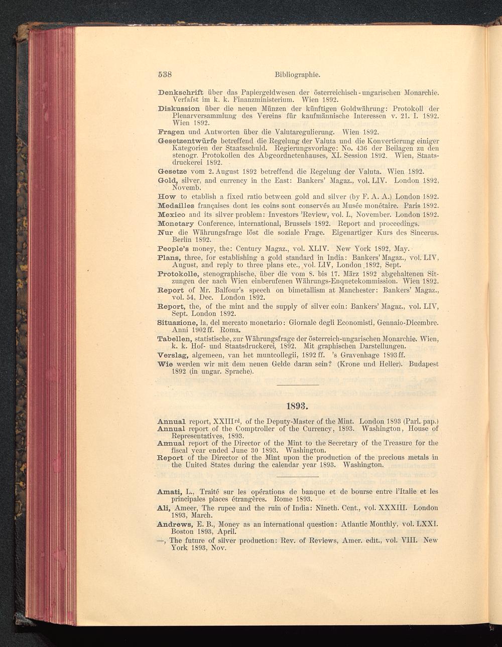 Annual report, XXIIDd, of the Deputy-Master of tlie Mint. London 1893 (Pari, pap.)Annual report of the Comptroller of the Currency, 1893. Washington , Ilouse of