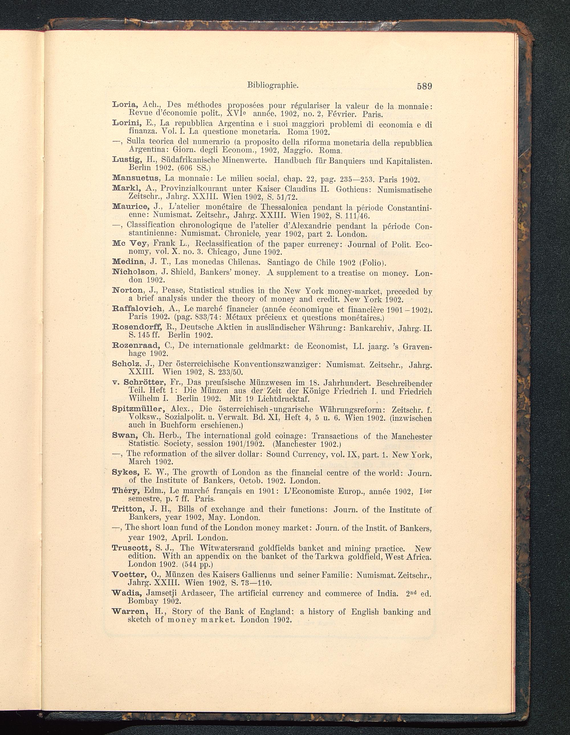 Loria, Ach., Des methodes proposees pour r^gulariser la valeur de la monnaie:Kevue d'economie polit., XYle annee, 1902, 110. 2, Fevrier. Paris.