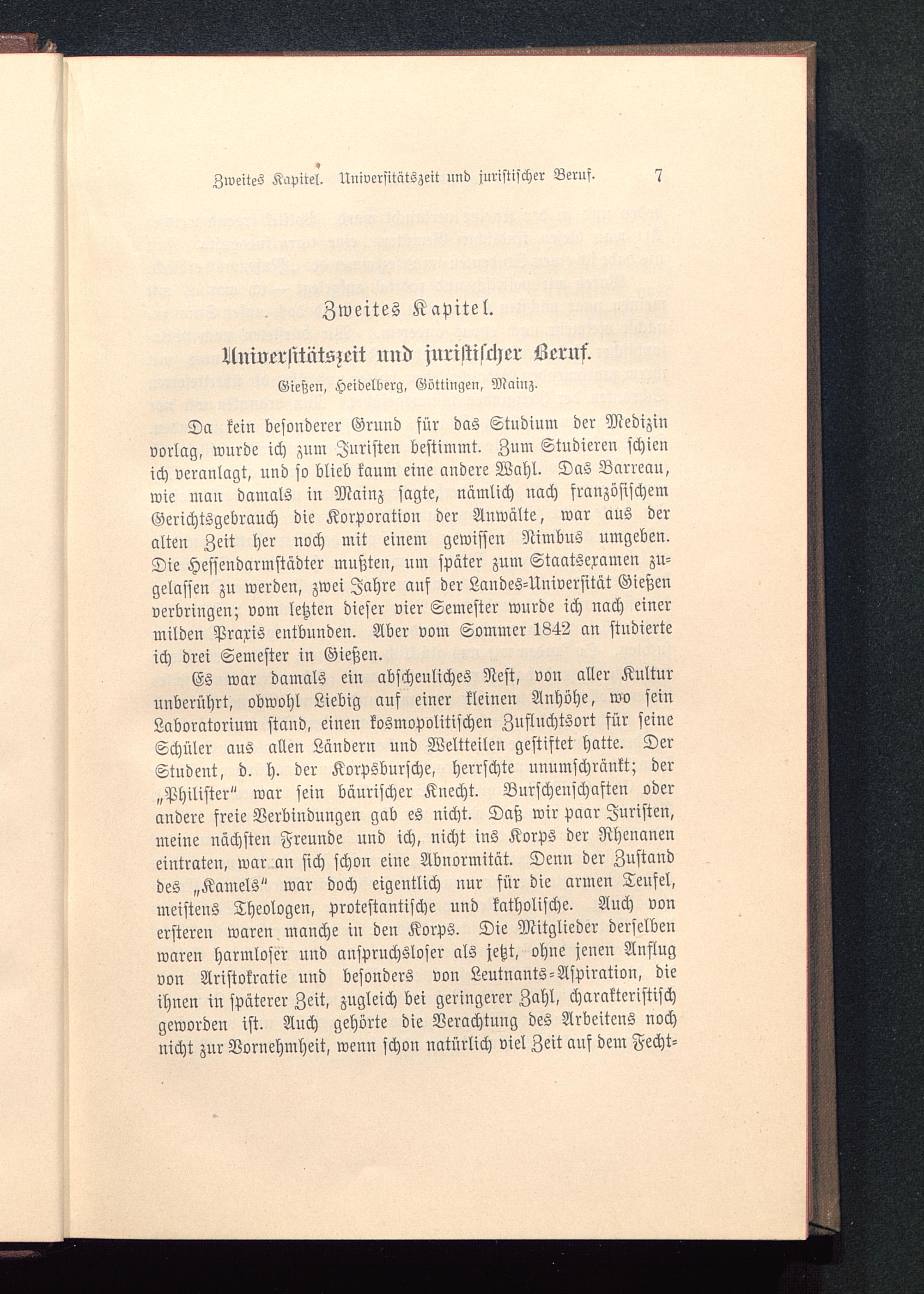 Da kein besonderer Grund für das Studium der Medizinvorlag, wurde ich zum Juristen bestimmt. Zum Studieren schienich veranlagt, uud so blieb kaum eine andere Wahl. Das Barreau,wie man damals in Mainz sagte, nämlich nach französischemGerichtsgebrauch die Korporation der Anwälte, war aus deralten Zeit her noch mit einem gewissen Nimbus umgeben.Die Hessendarmstädter mußten, um später zum Staatsexamen zu-gelassen zn werden, zwei Jahre auf der Landes-Universität Gießenverbringen; vom letzten dieser vier Semester wurde ich nach einermilden Praxis entbunden. Aber vom Sommer 1842 an studierteich drei Semester in Gießen .