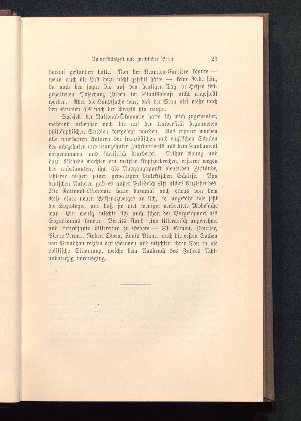Speziell der National-Ökonomie hatte ich mich zugewendet,während nebenher noch die aus der Universität begonnenenphilosophischen Studien fortgesetzt wnrden. Aus ersterer wurdenalle namhaften Autoren der französischen und englischen Schulendes achtzehnten nnd neunzehnten Jahrhunderts aus dem Fundamentvorgenommen und schriftlich bearbeitet. Arthur Aoung unddazu Ricardo machten am meisten Kopfzerbrechen, ersterer wegender unbekannten, ihm als Ausgangspunkt dienenden Zustände,letzterer wegen seiner gewaltigen dialektischen Schärfe. Vondeutschen Autoren gab es außer Friedrich List nichts Anziehendes.Die National-Ökonomie hatte dazumal noch etwas von demReiz eines neuen Wissenszweiges an fich, so ungefähr wie jetztdie Soziologie, nur daß sie viel weniger verbreitete Modesachewar. Ein wenig mischte sich auch schon der Vorgeschmack desSozialismns hinein. Bereits stand eine litterarisch angenehmeund interessante Litteratur zu Gebote — St. Simon, Fourier,Pierre Leroux, Robert Owen, Louis Blanc ; auch die ersten Sachenvon Proudhon reizten den Gaumen und mischten ihren Ton in diepolitische Stimmung, welche dem Ausbruch des Jahres Acht-undvierzig vorausging.