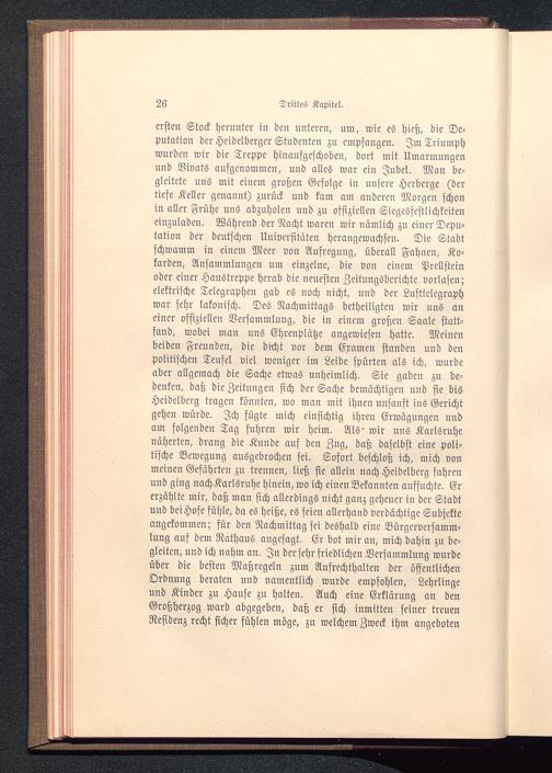 ersten Stock herunter in den unteren, um, wie es hieß, die De-putation der Heidelberger Studenten zu empfangen. Im Triumphwurden wir die Treppe hinaufgeschoben, dort mit Umarmungenund Vivats aufgenommen, uud alles war ein Jubel. Man be-gleitete uns mit einem großen Gefolge in unsere Herberge (dertiefe Keller genannt) zurück und kam am anderen Morgen schonin aller Frühe uns abzuholen und zu offiziellen Siegesfestlichkeiteneinzuladen. Während der Nacht waren wir nämlich zu einer Depu-tation der deutschen Universitäten herangewachsen. Die Stadtschwamm in einem Meer von Aufregung, überall Fahnen, Ko-karden, Ansammlungen um einzelne, die von einem Prellsteinoder einer Haustreppe herab die neuesten Zeitungsberichte vorlasen;elektrische Telegraphen gab es noch nicht, und der Lufttelegraphwar sehr lakonisch. Des Nachmittags betheiligten wir uns aneiner offiziellen Versammlung, die in einem großen Saale statt-fand, wobei man uns Ehrenplätze angewiesen hatte. Meinenbeiden Freunden, die dicht vor dem Examen standen nnd denpolitischen Tenfel viel weniger im Leibe spürten als ich, wurdeaber allgemach die Sache etwas unheimlich. Sie gaben zu be-denken, daß die Zeitungen sich der Sache bemächtigen und sie bisHeidelberg tragen könnten, wo man mit ihnen nnsauft ins Gerichtgehen würde. Ich fügte mich einsichtig ihren Erwägungen nndam folgenden Tag fahren wir heim. Als' wir uns Karlsruhe näherten, drang die Kunde auf den Zug, daß daselbst eiue poli-tische Bewegung ausgebrochen sei. Sofort beschloß ich, mich vonmeinen Gefährten zn trennen, ließ sie allein nach Heidelberg fahrenuud ging nachKarlsruhe hinein, wo ich einen Bekannten anffnchte. Ererzählte mir, daß man sich allerdings nicht ganz geheuer in der Stadtund bei Hofe fühle, da es heiße, es seien allerhand verdächtige Subjekteangekommen; für den Nachmittag sei deshalb eine Bürgerversamm-lung auf dem Rathaus augesagt. Er bot mir an, mich dahin zu be-gleiten, und ich nahm an. In der sehr friedlichen Versammlung wurdeüber die besten Maßregeln zum Aufrechthalten der öffentlichenOrdnung beraten und namentlich wurde empfohlen, Lehrlingeund Kinder zu Hause zu halten. Auch eine Erklärung an denGroßherzog ward abgegeben, daß er sich inmitten seiner treuenResidenz recht sicher fühlen möge, zu welchem Zweck ihm angeboten