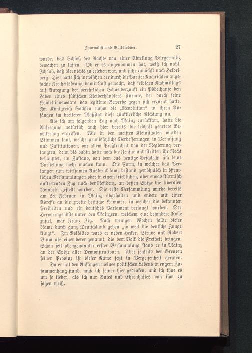 Als ich am folgenden Tag nach Mainz zurückkam, hatte dieAufregung natürlich anch hier bereits die lebhaft geartete Be-völkerung ergriffen. Wie iu den meisten Kleinstaaten wurdenStimmen laut, welche grundsätzliche Verbesserungen in Verfassungund Institutionen, vor allem Preßfreiheit von der Regierung ver-langten, denn bis dahin hatte noch die Zensur unbestritten ihr Rechtbehauptet, ein Zustand, von dem das heutige Geschlecht sich keineVorstellung mehr machen kann. Die Form, in welcher das Ver-langen znm wirksamen Ausdruck kam, bestand gewöhnlich in öffent-lichen Versammlungen oder in einem friedlichen, aber etwas stürmischauftretenden Zug uach der Residenz, an dessen Spitze die liberalenNotabeln gestellt wurden. Die erste Versammlung wnrde bereitsam 23. Febrnar in Mainz abgehalten nnd endete mit einerAdresse an die zweite hessische Kammer, in welcher die bekanntenFreiheiten und ein deutsches Parlament verlangt wurden. DerHervorragendste unter den Mainzern, welchem eine besondere Rollezufiel, war Franz Zitz . Nach wenigen Wochen sollte dieserName durch ganz Deutschland gehen „so weit die deutsche Zuugeklingt". Im Volkslied ward er neben Hecker, Struve und RobertBlnm als einer derer genannt, die dem Volk die Freiheit bringen.Schon seit obengenannter erster Versammlung stand er in Mainz an der Spitze aller Demonstrationen. Aber jenseits der Grenzenseiner Provinz ist dieser Name jetzt in Vergessenheit geraten.