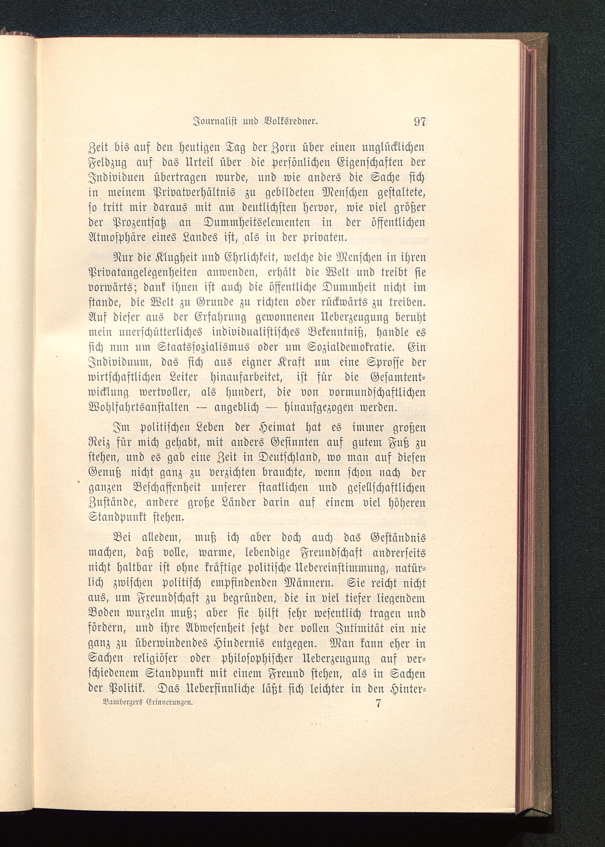 Im politischen Leben der Heimat hat es immer großenReiz für mich gehabt, mit anders Gesinnten auf gntem Fuß zustehen, und es gab eine Zeit in Deutschland , wo man auf diesenGenuß nicht ganz zu verzichten brauchte, wenn schon nach derganzen Beschaffenheit unserer staatlichen und gesellschaftlichenZustände, andere große Länder darin auf eiuem viel höherenStandpunkt stehen.