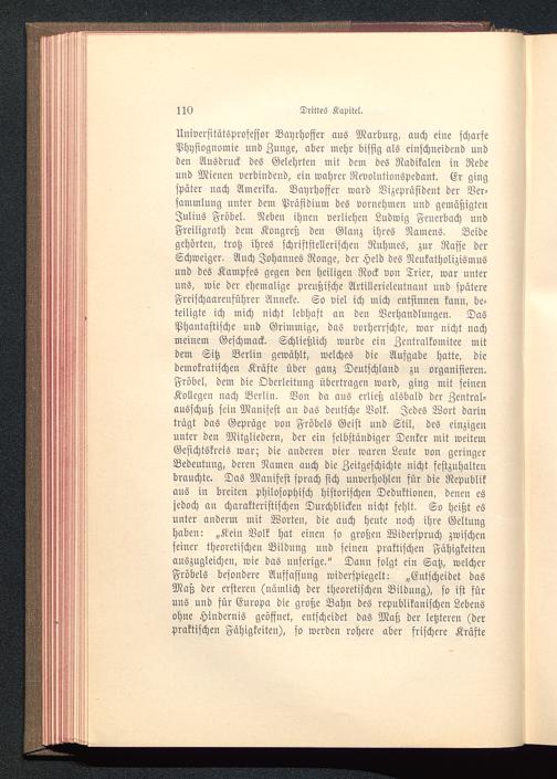 Universitätsprofessor Bayrhoffer aus Marburg , auch eine scharfePhysiognomie uud Zunge, aber mehr bissig als einschneidend uudden Ausdruck des Gelehrten mit dem des Radikalen in Redeuud Mienen verbindend, ein wahrer Revolutionspedant. Er gingspäter nach Amerika . Bayrhoffer ward Vizepräsident der Ver-sammlung uuter dem Präsidium des vornehmen und gemäßigtenJulius Fröbel. Neben ihnen verliehen Ludwig Feuerbach uudFreiligrath dem Kongreß den Glanz ihres Namens. Beidegehörten, trotz ihres schriftstellerischen Ruhmes, zur Rasse derSchweiger. Auch Johannes Ronge , der Held des Neukatholizismnsund des Kampfes gegen den heiligen Rock von Trier, war unteruns, wie der ehemalige preußische Artillerieleutnant uud spätereFreischaareuführer Anneke. So viel ich mich entsinnen kann, be-teiligte ich mich nicht lebhaft an den Verhandlungen. DasPhantastische uud Grimmige, das vorherrschte, war nicht nachmeinem Geschmack. Schließlich wurde ein Zentralkomitee mitdem Sitz Berlin gewählt, welches die Aufgabe hatte, diedemokratischen Kräfte über ganz Deutschland zn organisieren.Fröbel, dem die Oberleitung übertragen ward, ging mit seinenKollegen nach Berlin . Von da ans erließ alsbald der Zentral-ausschuß seiu Manifest an das deutsche Volk. Jedes Wort darinträgt das Gepräge von Fröbels Geist und Stil, des einzigenunter den Mitgliedern, der ein selbständiger Denker mit weitemGesichtskreis war; die anderen vier waren Leute von geringerBedeutung, deren Namen auch die Zeitgeschichte nicht festzuhaltenbrauchte. Das Manifest sprach sich unverhohlen für die Republik aus in breiten philosophisch historischen Deduktionen, denen esjedoch au charakteristischen Durchblicken nicht fehlt. So heißt esunter anderm mit Worten, die auch heute noch ihre Geltunghaben: „Kein Volk hat einen so großen Widerspruch zwischenseiner theoretischen Bildung und seiuen praktischen Fähigkeitenauszugleichen, wie das uuserige." Dauu folgt eiu Satz, welcherFröbels besondere Auffafsnng widerspiegelt: „Entscheidet dasMaß der ersteren (nämlich der theoretischen Bildung), so ist füruns und für Europa die große Bahn des republikanischen Lebensohne Hindernis geöffnet, entscheidet das Maß der letzteren (derpraktischen Fähigkeiten), so werden rohere aber frischere Kräfte