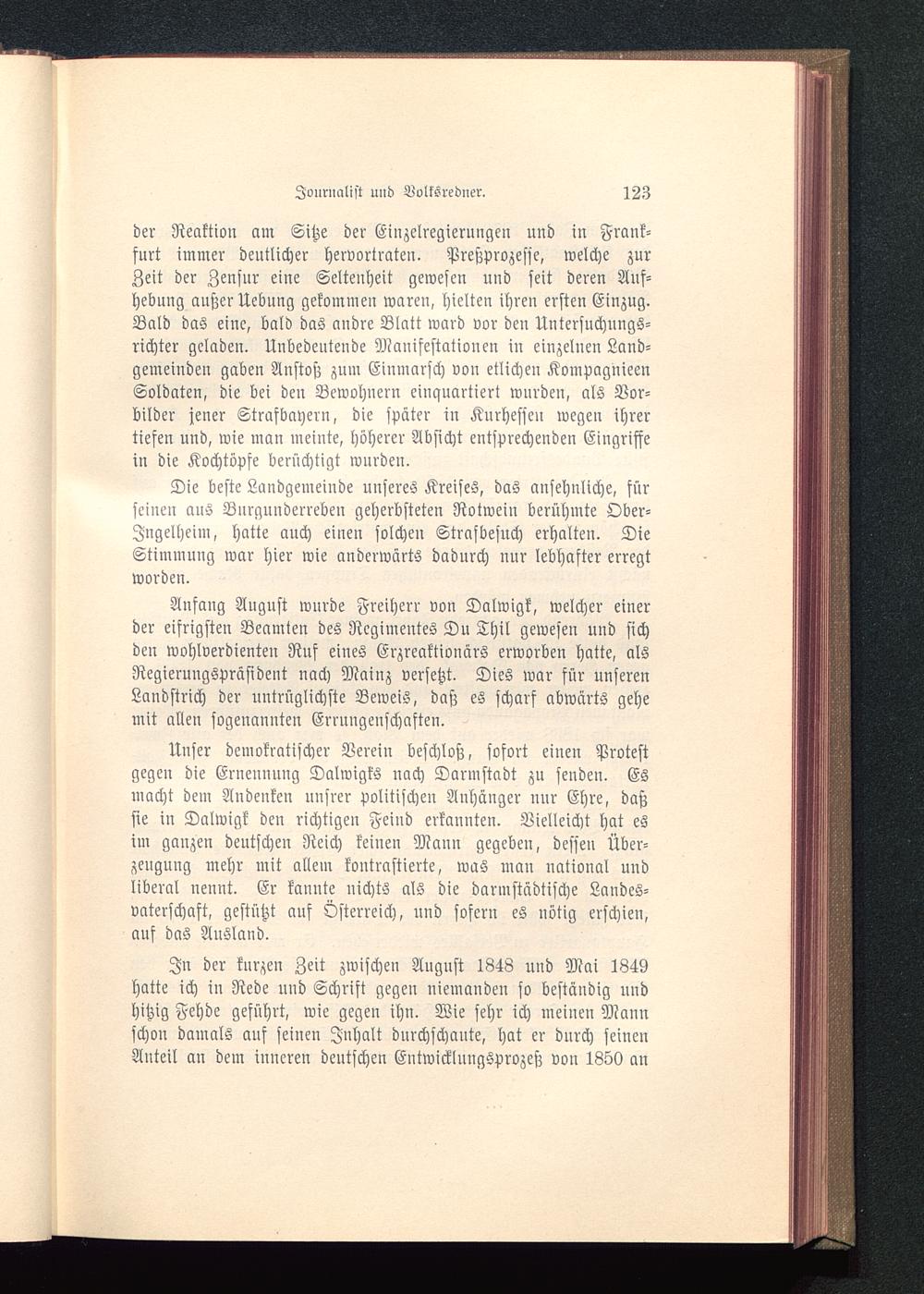 Ansaug August wurde Freiherr von Dalwigk, welcher einerder eifrigsten Beamten des Regimentes Du Thil gewesen uud sichden wohlverdienten Ruf eines Erzreaktionärs erworben hatte, alsRegierungspräsident nach Mainz versetzt. Dies war für unserenLandstrich der untrüglichste Beweis, daß es scharf abwärts gehemit allen sogenannten Errungenschaften.
