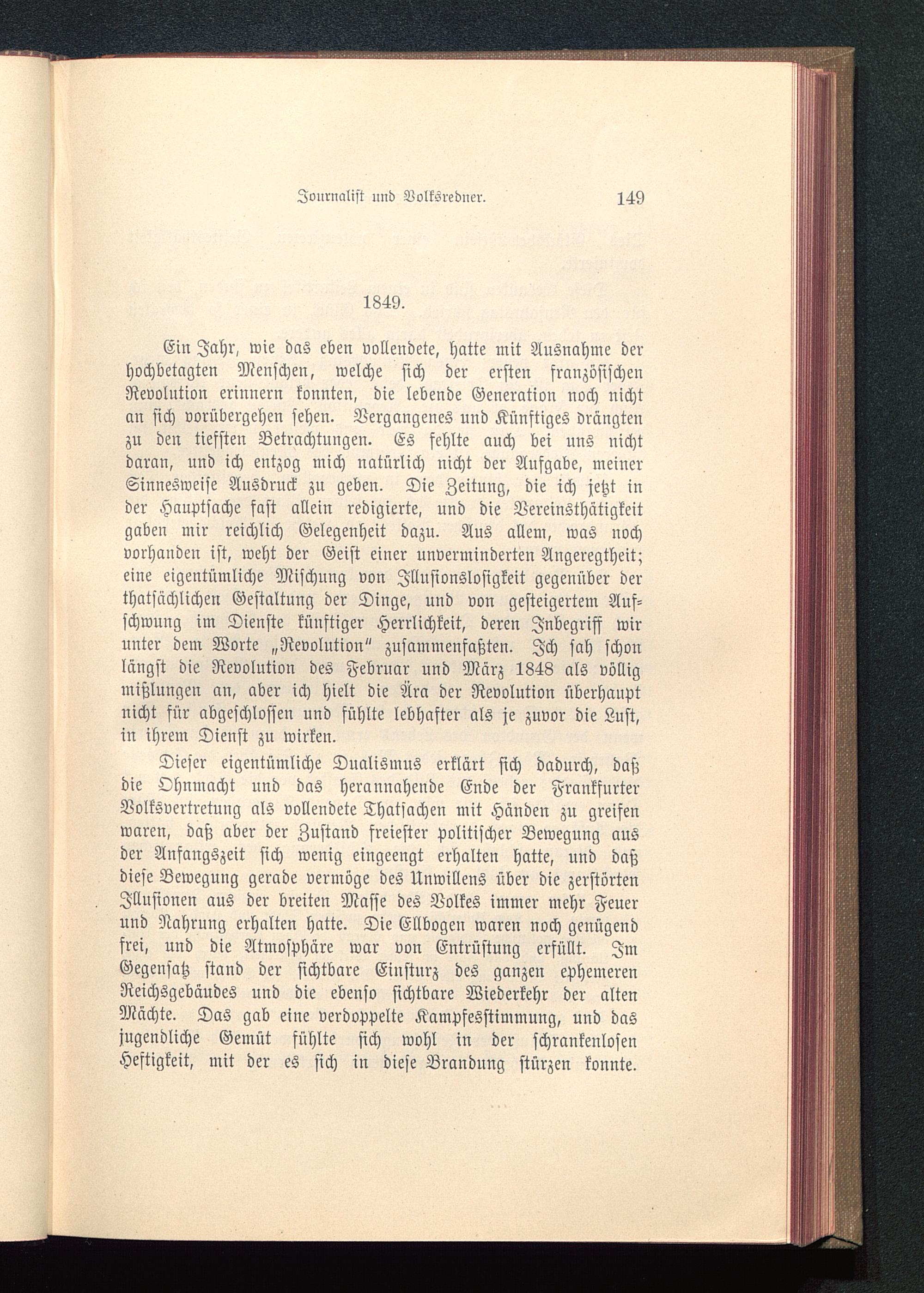 Ein Jahr, wie das eben vollendete, hatte mit Ausnahme derhochbetagten Menschen, welche sich der ersten französischenRevolution erinnern konnten, die lebende Generation noch nichtau sich vorübergehen sehen. Vergangenes und Künftiges drängtenzu den tiefsten Betrachtungen. Es fehlte auch bei uns nichtdaran, und ich entzog mich natürlich nicht der Aufgabe, meinerSinnesweise Ausdruck zu geben. Die Zeitung, die ich jetzt inder Hauptsache fast allein redigierte, und die Vereinsthätigkeitgaben mir reichlich Gelegenheit dazu. Aus allem, was nochvorhanden ist, weht der Geist einer unverminderten Angeregtheit;eine eigentümliche Mischung von Jllusionslosigkeit gegenüber derthatsächlichen Gestaltung der Dinge, und von gesteigertem Auf-schwung im Dienste künftiger Herrlichkeit, deren Inbegriff wiruuter dem Worte „Revolution" zusammenfaßten. Ich sah schonlängst die Revolution des Februar und März 1848 als völligmißlungen an, aber ich hielt die Ära der Revolution überhauptnicht für abgeschlossen und fühlte lebhafter als je zuvor die Lust,in ihrem Dienst zu wirken.