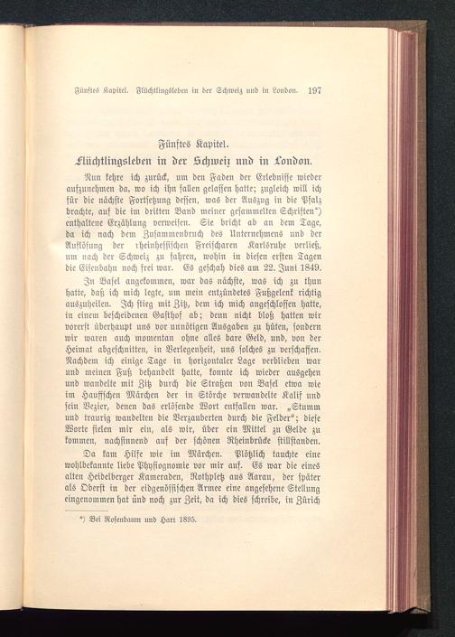 Nun kehre ich zurück, um den Faden der Erlebnisse wiederanszuuehmen da, wo ich ihn fallen gelassen hatte; zugleich will ichfür die nächste Fortsetzung dessen, was der Auszug in die Pfalzbrachte, auf die im dritten Band meiner gesammelten Schriften*)enthaltene Erzählung verweisen. Sie bricht ab an dem Tage,da ich nach dem Zusammenbruch des Unternehmens und derAuflösung der rheinhessischen Freischaren Karlsruhe verließ,um uach der Schweiz zu fahren, wohin in diesen ersten Tagendie Eisenbahn noch frei war. Es geschah dies am 22. Juni 1849.