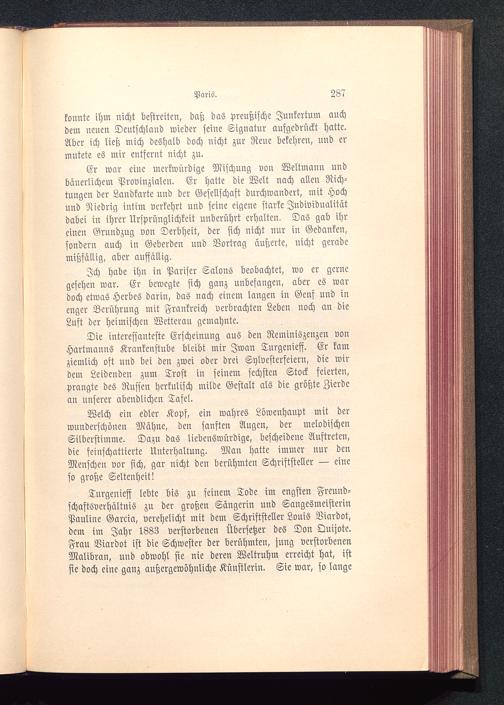 Tnrgenieff lebte bis zu seinem Tode im engsten Freund-schaftsverhältnis zu der großen Sängerin und SangesmeisterinPauline Garcia, verehelicht mit dem Schriftsteller Louis Viardot ,dem im Jahr 1883 verstorbenen Übersetzer des Don Quijote .Frau Viardot ist die Schwester der berühmten, jung verstorbenenMalibran , und obwohl sie nie deren Weltruhm erreicht hat, istsie doch eine ganz außergewöhnliche Künstlerin. Sie war, so lange