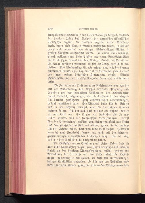 Ausgabe von Scheidemünze ans diesem Metall zu der Zeit, als Endeder siebziger Jahre das Vorspiel der agrarisch-antisemitischenDemagogie begann, die erwähnte Legende meiner Nickelberg-werke, denen diese Münzen Gewinn verschaffen sollten, in Umlansgesetzt und uameutlich von einigen stöckerianischen Pfaffen ingroßem Maßstab ausgebeutet wurde. In einem Verleumdungs-prozeß zwischen einem dieser Pfaffen und einem Rheinischen Blattwurde ich sogar eiumal von dem Mainzer Gericht auf Requisitionals Zeuge darüber vernommen, ob sich die Dinge wirklich so ver-hielten. Das Merkwürdige ist, wie gesagt, nur, daß die Legendeaufkommen konnte, ohne daß einer ihrer Verbreiter jemals etwasvon ihrem wahren historischen Hintergrund erfuhr. Wievielschöner hätte sich die liebliche Nachrede dann noch ausstaffierenlassen!