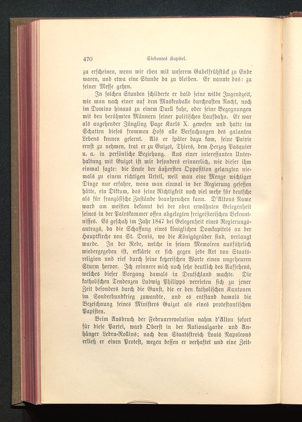In solchen Stunden schilderte er bald seine wilde Jugendzeit,wie man nach einer aus dem Maskeuballe durchrasten Nacht, nochim Domino hinaus zu einem Duell fuhr, oder seine Begegnungenmit den berühmten Männern seiner politischen Laufbahn. Er warals angehender Jüngling Page Karls X. gewesen und hatte imSchatten dieses frommen Hofs alle Verfnchnngen des galantenLebens kennen gelernt. Als er später dazn kam, seine Pairieernst zu nehmen, trat er zu Guizot , Thiers, dem Herzog Pasquieru. a. in persönliche Beziehung. Ans einer interessanten Unter-haltung mit Guizot ist mir besonders erinnerlich, wie dieser ihmeinmal sagte: die Leute der äußerste» Opposition gelangten nie-mals zu einem richtigen Urteil, weil man eine Menge wichtigerDinge nur erfahre, wenn man einmal in der Regierung gesessenhätte, ein Diktnm, das seine Richtigkeit noch viel mehr für deutscheals für französische Zustände beanspruchen kann. DÄltons Nameward am meisten bekannt bei der oben erwähnten Gelegenheitseines in der Pairskammer offen abgelegten sreigeisterischen Bekennt-nisses. Es geschah im Jahr 1847 bei Gelegenheit eines Regierungs-antrags, da die Schaffung eines königlichen Domkapitels an derHauptkirche von St. Denis, wo die Königsgräber sind, verlangtwurde. In der Rede, welche in seinen Memoiren ausführlichwiedergegeben ist, erklärte er sich gegen jede Art von Staats-religion und rief durch seine ketzerischen Worte einen ungeheurenSturm hervor. Ich erinnere mich noch sehr deutlich des Aufsehens,welches dieser Vorgang damals in Deutschland machte. Diekatholischen Tendenzen Ludwig Philipps verrieten sich zu jenerZeit besonders durch die Guust, die er den katholischen Kantonenim Sonderbundkrieg zuwandte, und es entstand damals dieBezeichnung seines Ministers Guizot als eines protestantischenPapisten.