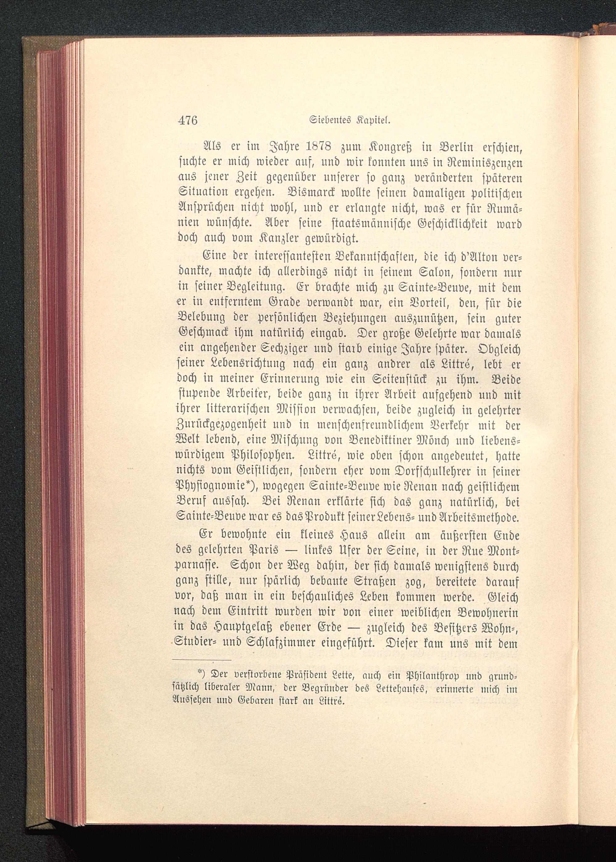 Eine der interessantesten Bekanntschaften, die ich d'Alton ver-dankte, machte ich allerdings nicht in seinem Salon, sondern nurin seiner Begleitung. Er brachte mich zu Sainte-Beuve , mit demer in entferntem Grade verwandt war, ein Vorteil, den, für dieBelebung der persönlichen Beziehungen auszunützen, sein guterGeschmack ihm natürlich eingab. Der große Gelehrte war damalsein angehender Sechziger und staib einige Jahre später. Obgleichfeiner Lebensrichtung nach ein ganz andrer als Littrs, lebt erdoch in meiner Erinnerung wie ein Seitenstück zu ihm. Beidestupende Arbeiter, beide ganz in ihrer Arbeit aufgehend und mitihrer litterarischen Mission verwachsen, beide zugleich in gelehrterZurückgezogeuheit und in menschenfreundlichem Verkehr mit derWelt lebend, eine Mischung von Benediktiner Mönch nnd liebens-würdigem Philosophen. Littrs, wie oben schon angedeutet, hattenichts vom Geistlichen, sondern eher vom Dorsschnllehrer in seinerPhysiognomie*), wogegen Sainte-Beuve wie Renan nach geistlichemBeruf aussah. Bei Renan erklärte sich das ganz natürlich, beiSainte-Beuve war es das Produkt seiuerLebens- uud Arbeitsmethode.