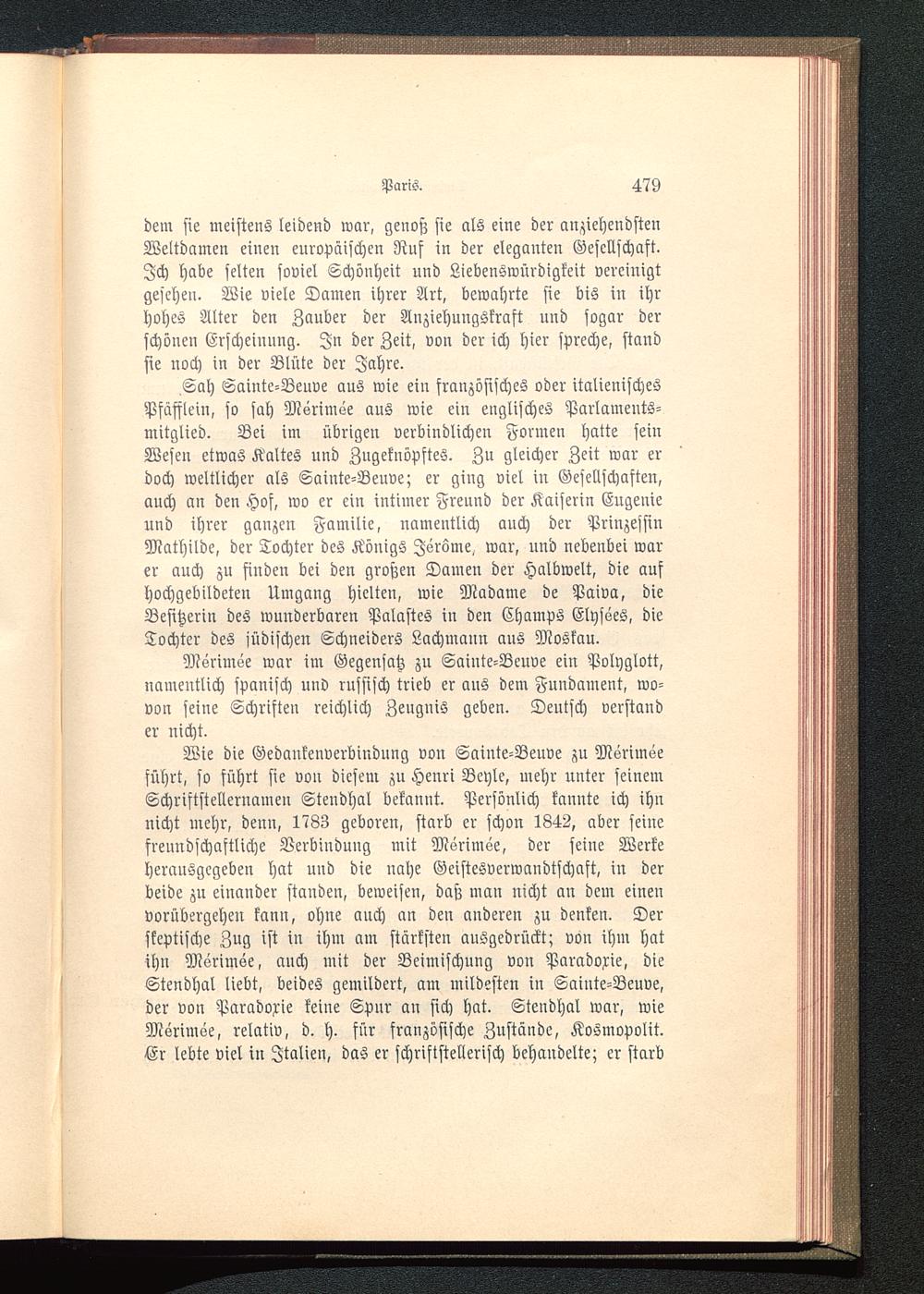 Sah Sainte-Beuve aus wie ein französisches oder italienischesPfäfflein, so sah Msrimse aus wie ein englisches Parlaments-mitglied. Bei im übrigen verbindlichen Formen hatte seinWesen etwas Kaltes uud Zugekuöpftes. Zu gleicher Zeit war erdoch weltlicher als Sainte-Beuve; er ging viel in Gesellschaften,auch an den Hof, wo er ein intimer Freund der Kaiserin Engenieund ihrer ganzen Familie, namentlich anch der PrinzessinMathilde, der Tochter des Königs Jsröme, war, und nebenbei warer anch zu finden bei den großen Damen der Halbwelt, die aufhochgebildeten Umgang hielten, wie Madame de Paiva, dieBesitzerin des wunderbaren Palastes in den Champs Elysses, dieTochter des jüdischen Schneiders Lachmann aus Moskau .