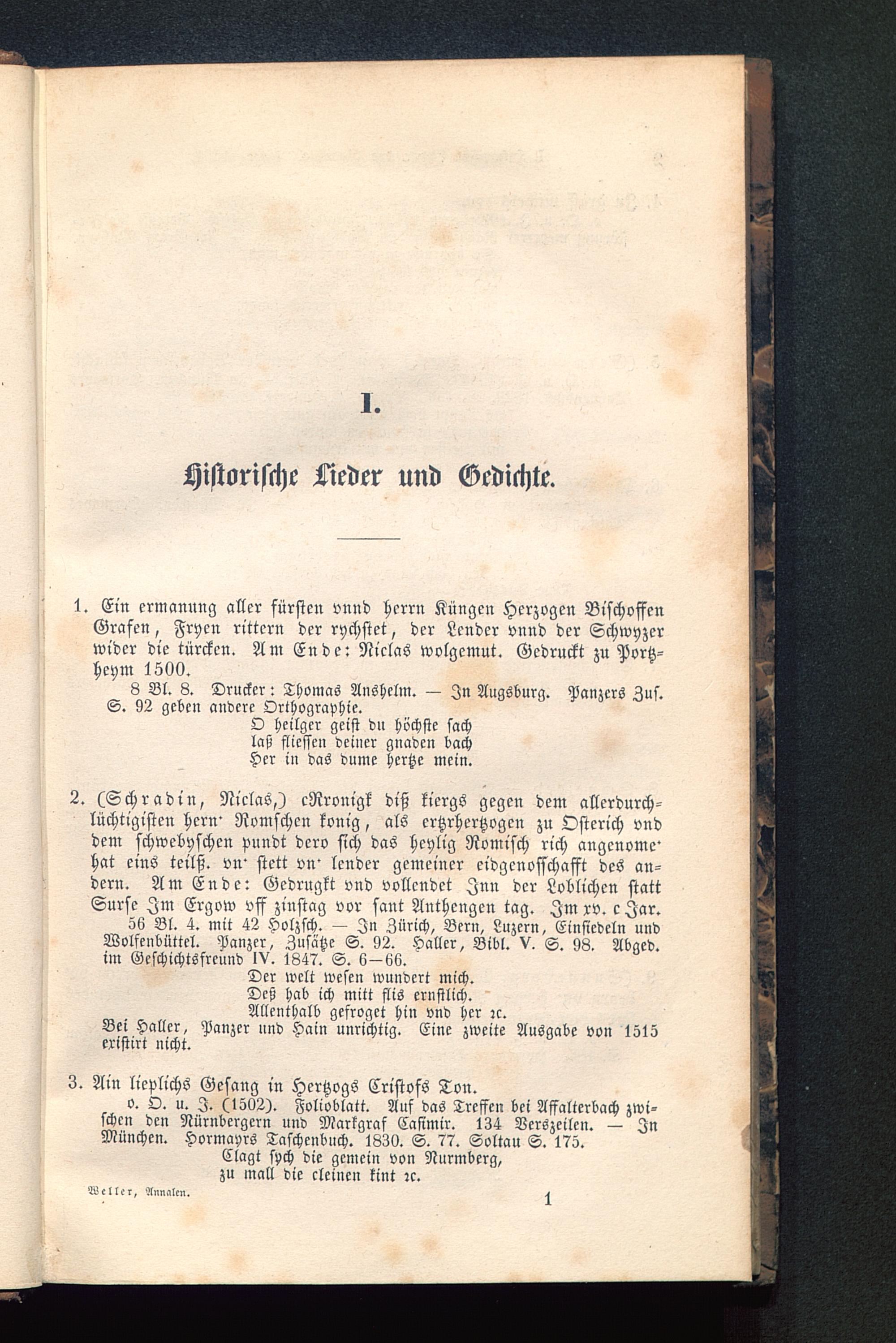1. Ein ermannng aller sürstcn vnnd Herrn Küngcn Herzogen BischoffenGrafen, Frycn rittcrn der rychstet, der Lendcr vnnd der Schwyzcrwider die türckcn. Am Ende: Niclas wolgemut. Gedruckt zu Portz-heym 1500.
