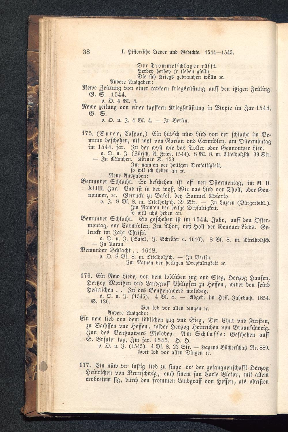 o. I. 8 Bl. 8. in. Titelholzsch, 39 Str. - In Luzern (Bürgerbibl.).Im Nam'cn der heilgc Dryfaltigkeit,so will ichs heben an.Bemunder Schlacht. So geschehen ist im 1544. Jahr, auff den Oster-montag, vor Carmiolen, Im Thon, deß Holl der Genouer Lieds. Ge-truckt im Jahr Christi.