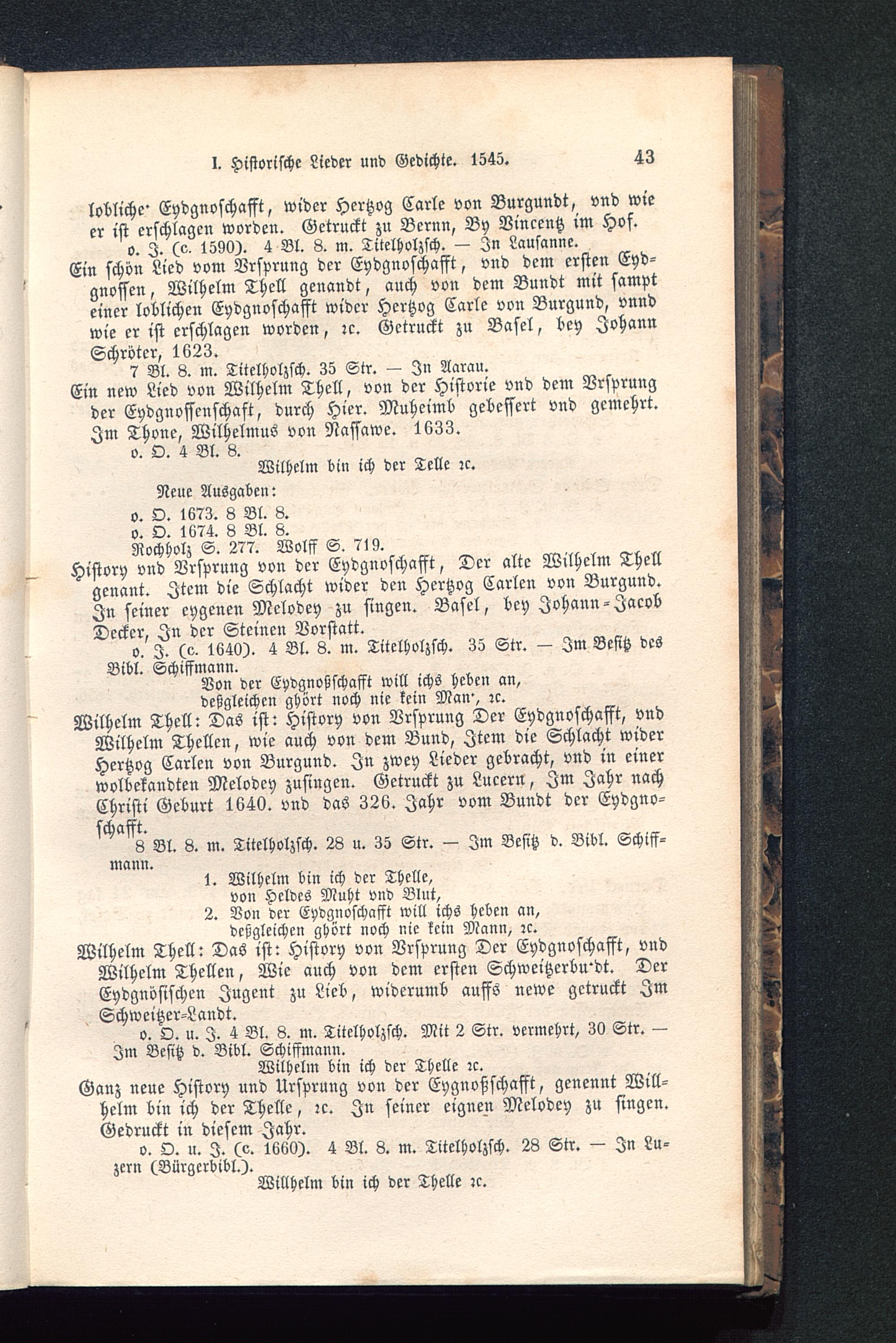 Wilhelm bin ich der Teile zc.Neue Ausgaben:o. O. 1673. 8 Bl. 8.o. O. 1674. 8 Bl. 8.Rochholz S. 277. Wolfs S. 719.History vnd Vrsprung von der Eydgnoschafft, Der alte Wilhelm Thellgenant. Item die Schlacht wider den Hertzog Carlen von Burgund.In seiner eygenen Mclodey zu singen. Basel , bey Johann-JacobDecker, In der Steinen Vorstatt.