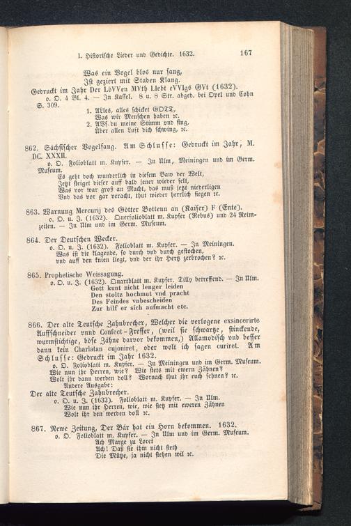 Was ein Vogel blos nur sang,Ist geziert mit Staden Klang.Gedruckt im Jahr Der LöVVen NVth Llebt cVVIgs GVt (1632).o. O. 4 Bl. 4. — In Kassel . 8 u. 8 Str. abged. bei Opel und CohnS. 309.