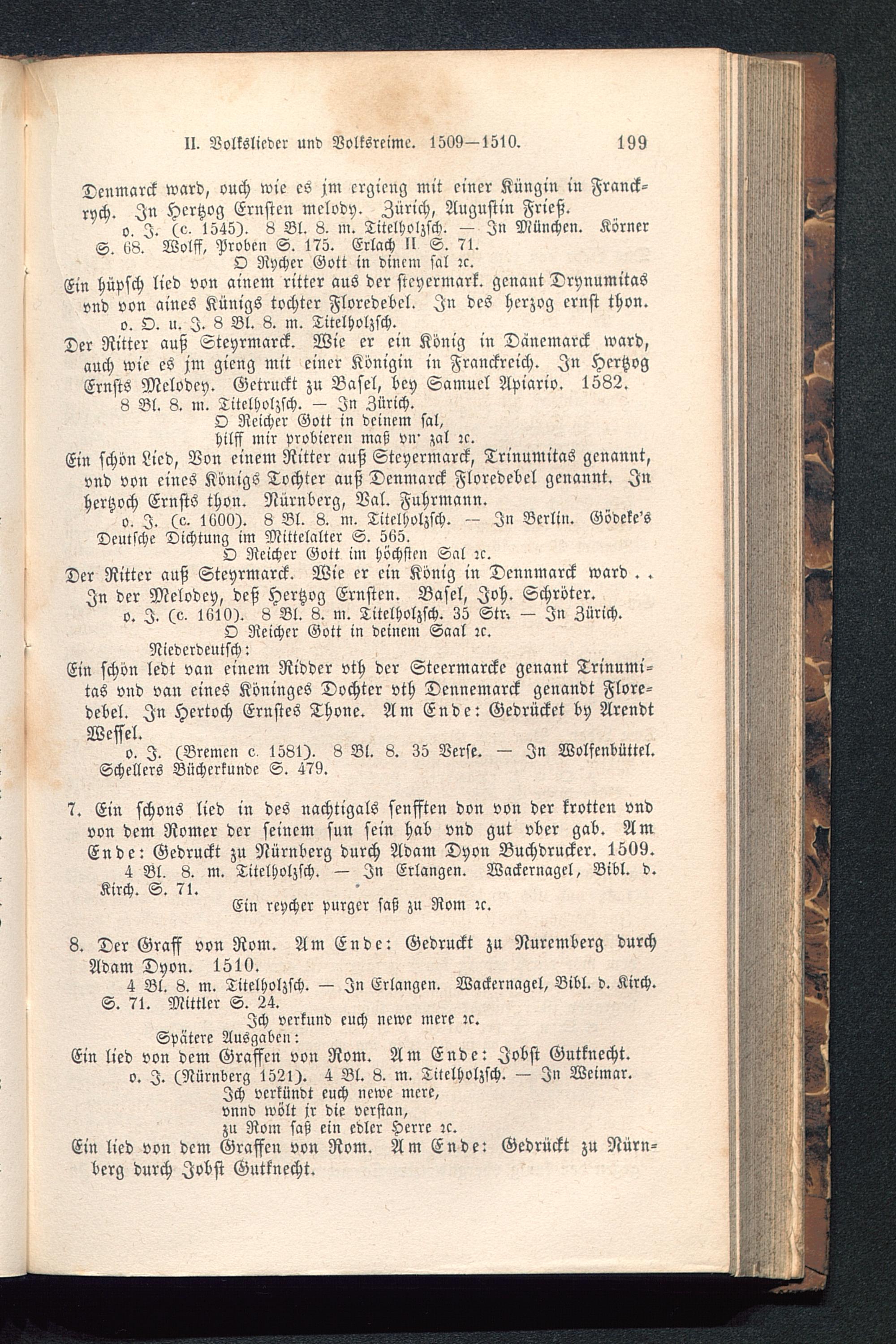 Ich verkünd euch newc mere:c.Spätere Ausgaben:Ein lied von dem Grasten von Rom . Am Ende: Jobst Gutknecht,o. I. (Nürnberg 1521). 4 Bl. 8. m. Titclholzsch. — In Weimar .Ich vcrktindt euch newc mere,vnnd wölt jr die verstan,zu Rom saß ein edler Herre :c.Ein lied von dem Grasten von Rom. Am Ende: Gedrückt zu Nürn-berg durch Jobst Gutknecht.