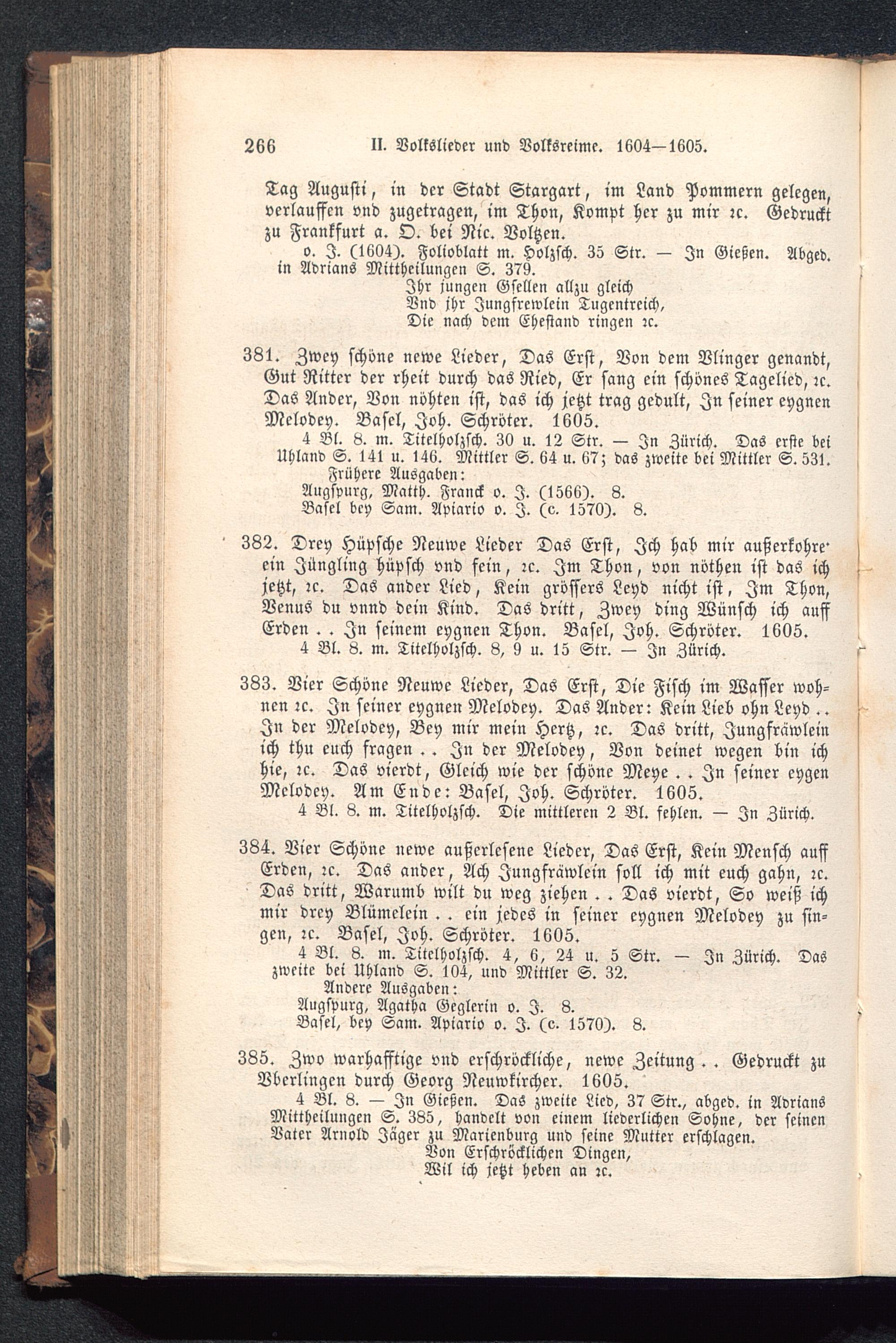 381. Zwey schöne newe Lieder, Das Erst, Von dem Vlinger genandt,Gut Ritter der rheit durch das Ried, Er sang ein schönes Tagelied, :c.Das Ander, Von nöhten ist, das ich jetzt trag gedult, In seiner eygnenMclodey. Basel , Joh. Schröter. 1605.