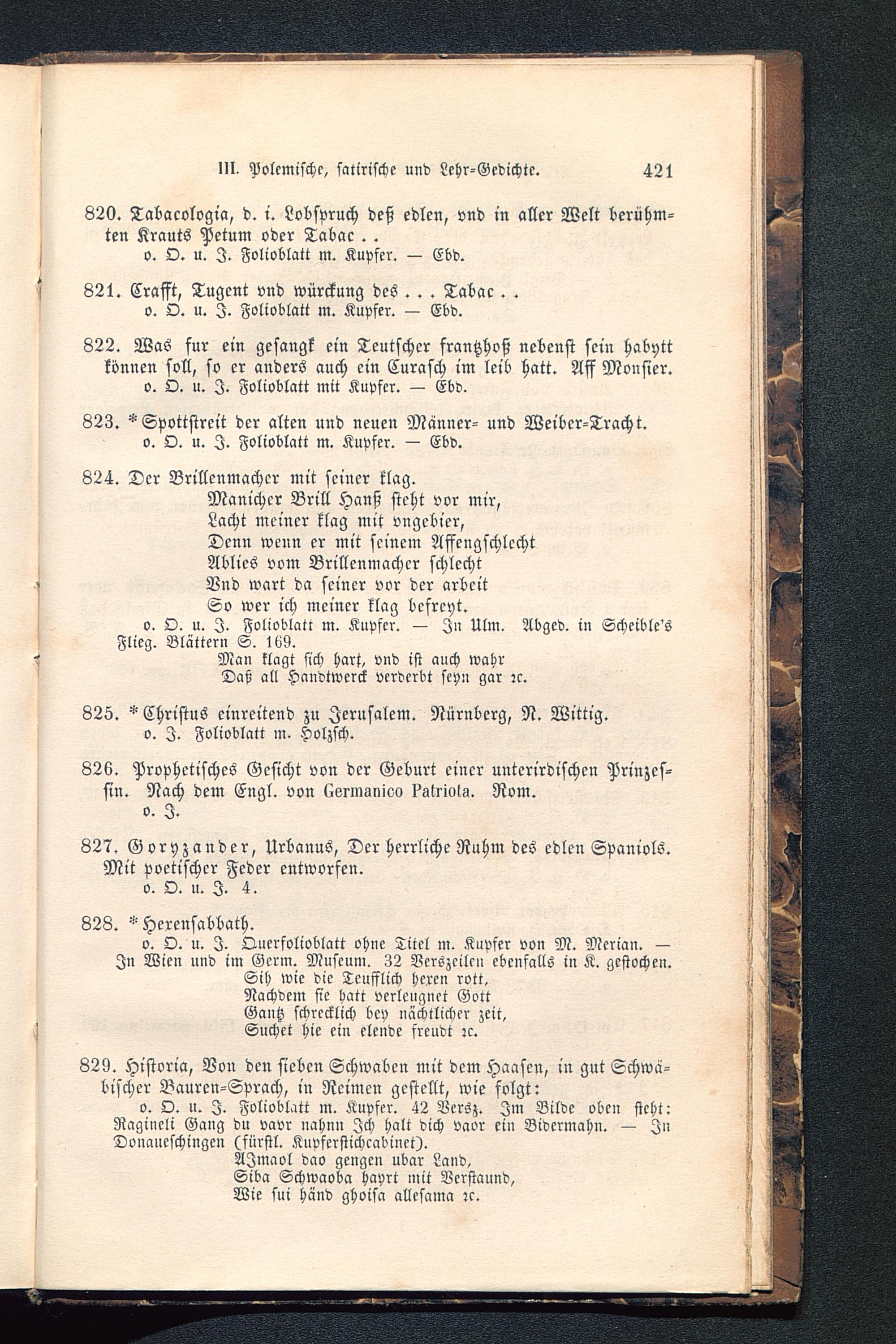 Manicher Brill Hanß steht vor mir,Lacht meiner klag mit vngebier,Denn wenn er mit seinem AffengschlcchtAblies vom Brillenmachcr schlechtVnd wart da seiner vor der arbeitSo wer ich meiner klag befrcyt.o. O. u. I. Folioblatt m. Kupfer. — I» Ulm. Abgcd. in Schcible'sFlieg. Blättern S. lti9.