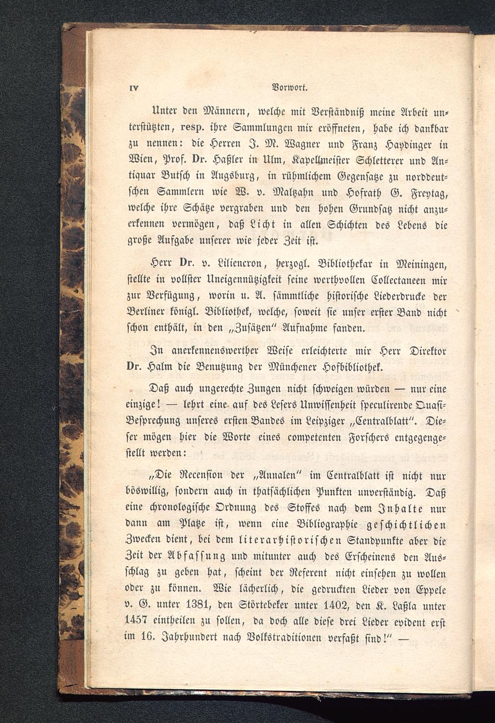 Herr Dr. v. Liliencron, herzogl. Bibliothekar in Meiningen ,stellte in vollster Uneigennützigkeit seine werthvollen Collectaneen mirzur Verfügung, worin u. A. sämmtliche historische Liederdrucke derBerliner königl. Bibliothek, welche, soweit sie unser erster Band nichtschon enthält, in den „Zusätzen" Aufnahme fanden.