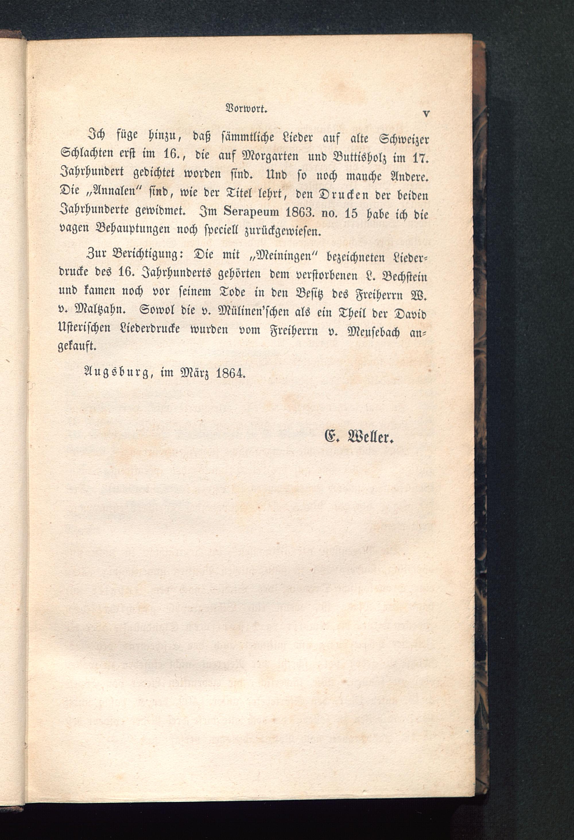 Ich fuge hinzu, daß sämmtliche Lieder auf alte Schweizer Schlachten erst im 16., die auf Morgarten und Buttisholz im 17.Jahrhundert gedichtet worden sind. Und so noch manche Andere.Die „Annalen " sind, wie der Titel lehrt, den Drucken der beidenJahrhunderte gewidmet. Im Sei-speum 1863. no. 15 habe ich dievagen Behauptungen noch speciell zurückgewiesen.