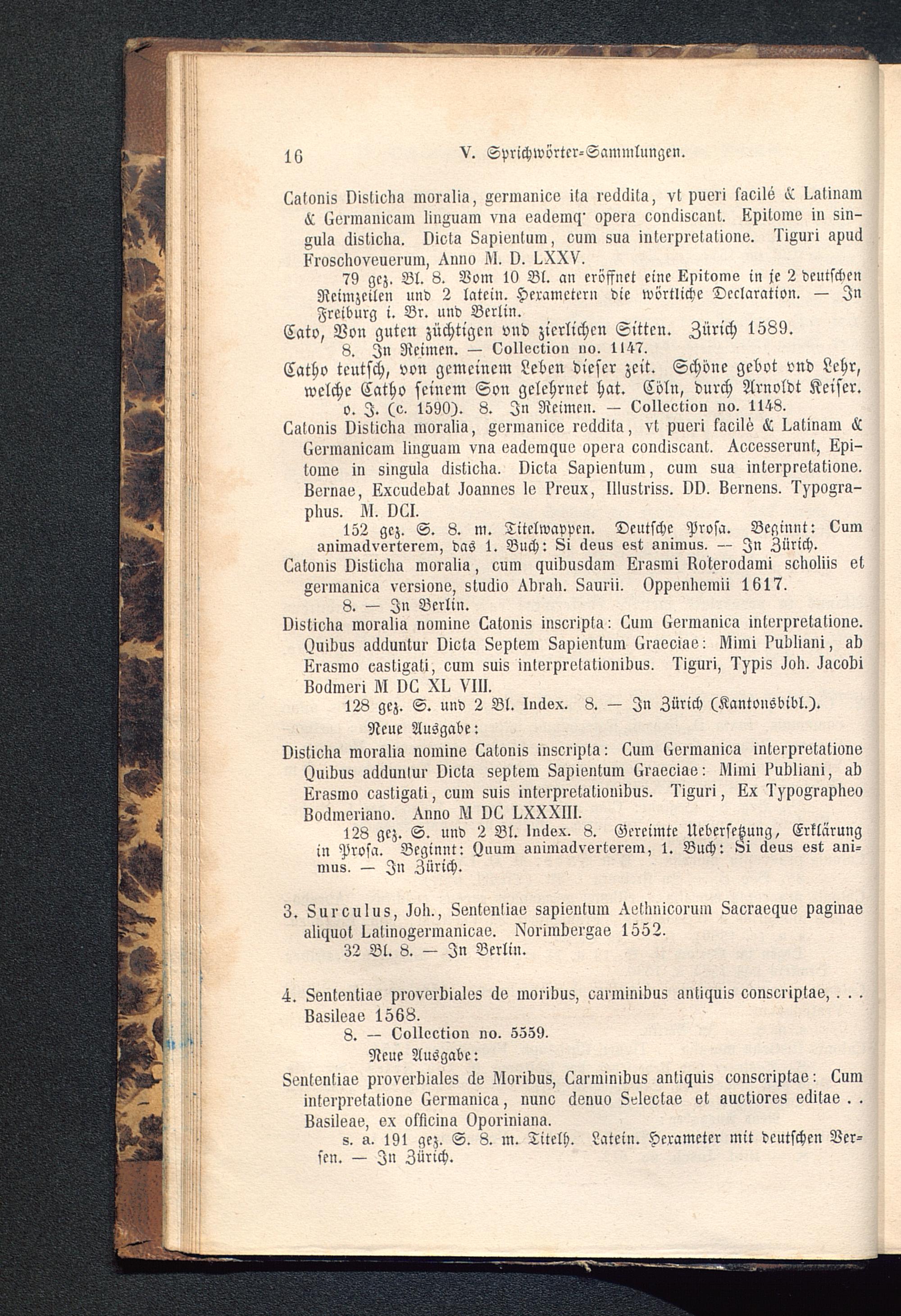 8. In Reimen. — Vollectiou »o. 1147.Catho teutsch, von gemeinem Leben dieser zeit. Schöne gebot vnd Lehr,welche Catho seinem Son gelehrnct hat. Cöln, durch Arnoldt Keiscr.o. I. (e, 1590). 8. In Reimen. — colleotion no. 1148.Lslonis visticki» morslia, guringnicc i'vääils, vt pucii kscilv Ä I^gtinsm ÄKermsniosm liiiAuam vna csäemquv opora conäiscanl. ^occssei'unl, Lpi-toms in singuls clisticka. Oicta Lapientum, cum sua inteinrötstions.öornac, Lxvuävligl ^ognnvs Ic I'ioux, lllustriss. OD, Körnens, I^'poZrs-plius. AI. 0LI.